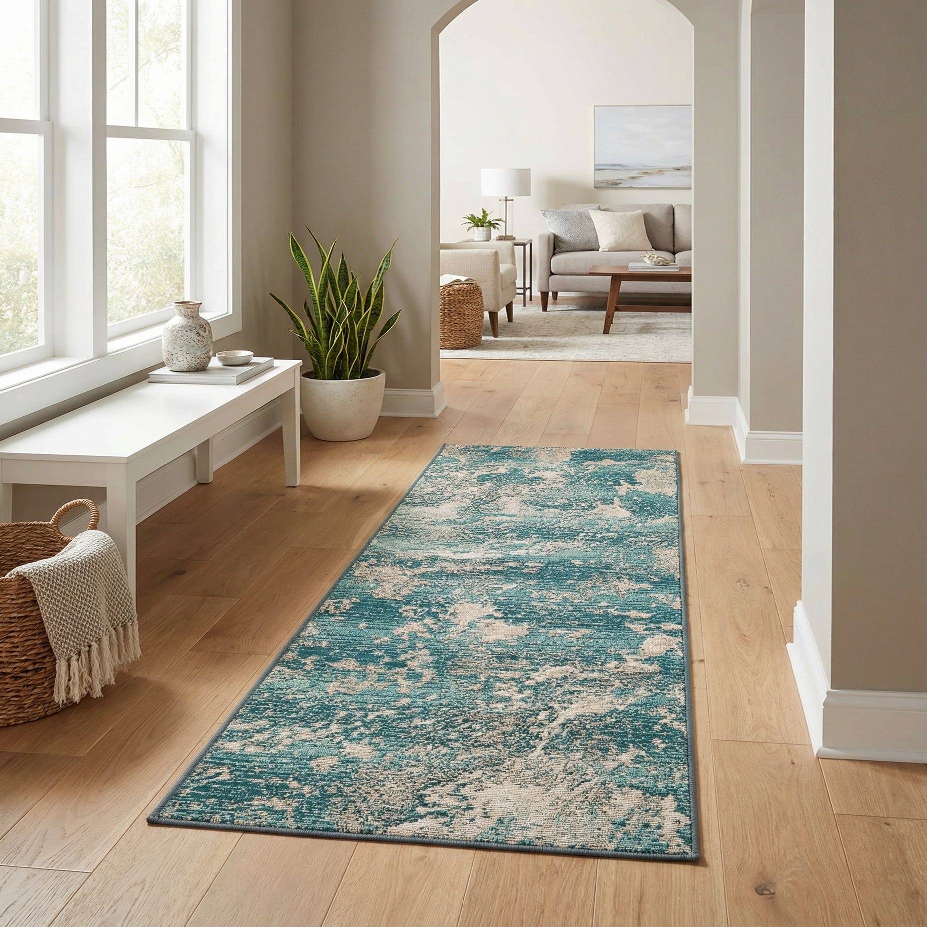 This runner works well as a hallway or entry accent, a covered-porch or sunroom anchor, or alongside a kitchen island to introduce color and movement. Pair it with white-washed woods, natural rattan, matte metal accents, or soft gray upholstery for a cohesive, modern coastal or transitional palette. Its polypropylene construction is appropriate for outdoor settings and high-traffic indoor areas, offering a reliable option where easygoing style matters.