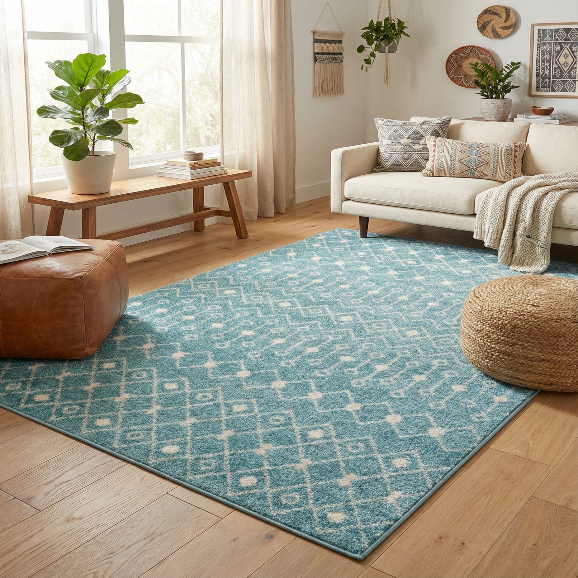 This piece works well as a grounding element in a living room under a coffee table, layered in a bedroom to add color and softness, or placed in a sunroom or casual dining area to introduce a coastal or modern-boho vibe. It pairs nicely with light woods, white or natural-fiber furnishings, rattan accents and navy or coral accessories for contrast, making it easy to incorporate into transitional, cottage, or beach-inspired interiors.