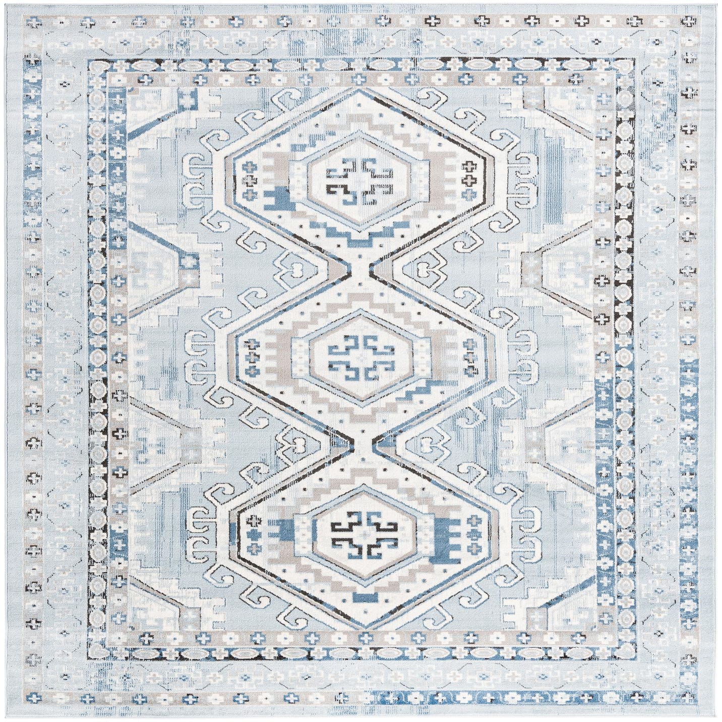 A 7x10 rectangular Charlotte Collection rug with a traditional tribal pattern in various shades of blue, grey, and white.