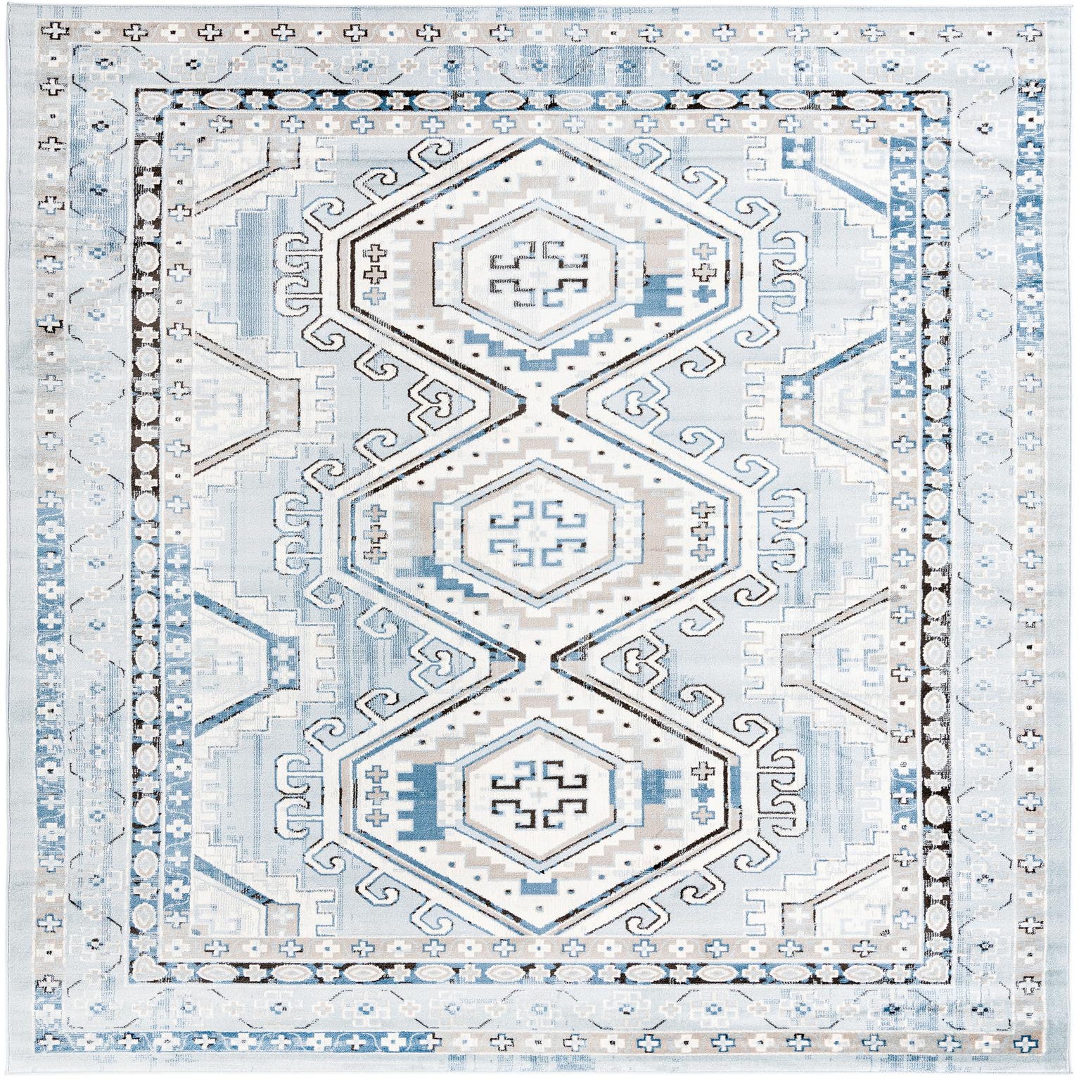 Aqua blue forms the soft field for a structured, geometric composition of linked hexagonal medallions and stepped motifs. Angular scrolls and layered borders of small crosses and oval motifs introduce black, ivory, beige and gray accents that give the pattern depth without overwhelming the background. Machine-made from 100% polypropylene, the rug has a low, smooth pile that feels soft underfoot and maintains a clean, even surface.