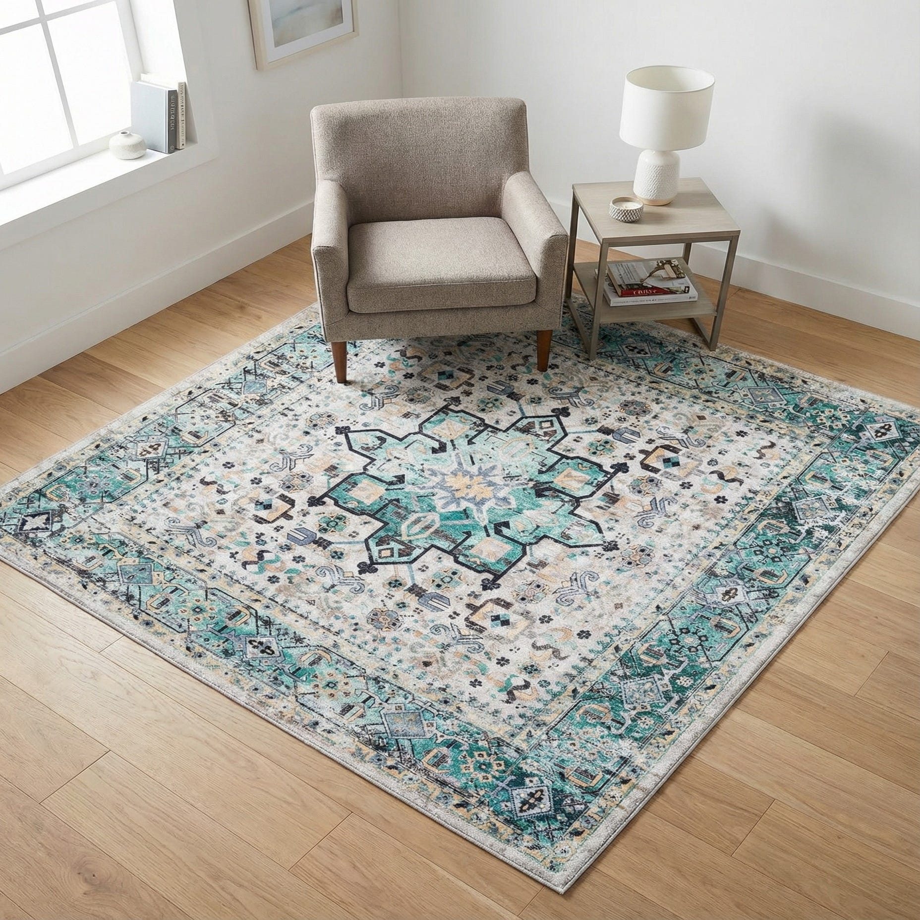 This piece works well in a range of interiors — place it under a small seating grouping or coffee table to add color and pattern to a contemporary living room, use it as a focal layer in a bedroom, or position it in an entry or study to introduce visual interest. The aqua-forward palette pairs particularly well with natural wood tones, crisp white trim, and navy or charcoal accents for a balanced, fresh look.