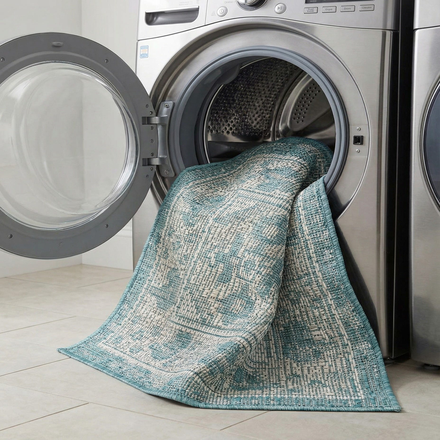 A traditional medallion pattern is woven across an aqua ground, where ivory and gray accents form the floral and border motifs with a softly weathered look. The design centers on a square medallion with stepped inner borders and repeat corner elements, giving a familiar, decorative layout that reads as relaxed and composed. Machine made from 100% polypropylene, the rug has a low, tightly woven surface you can feel underfoot—textured but firm—with short fringe along the edges. This piece is a sample.