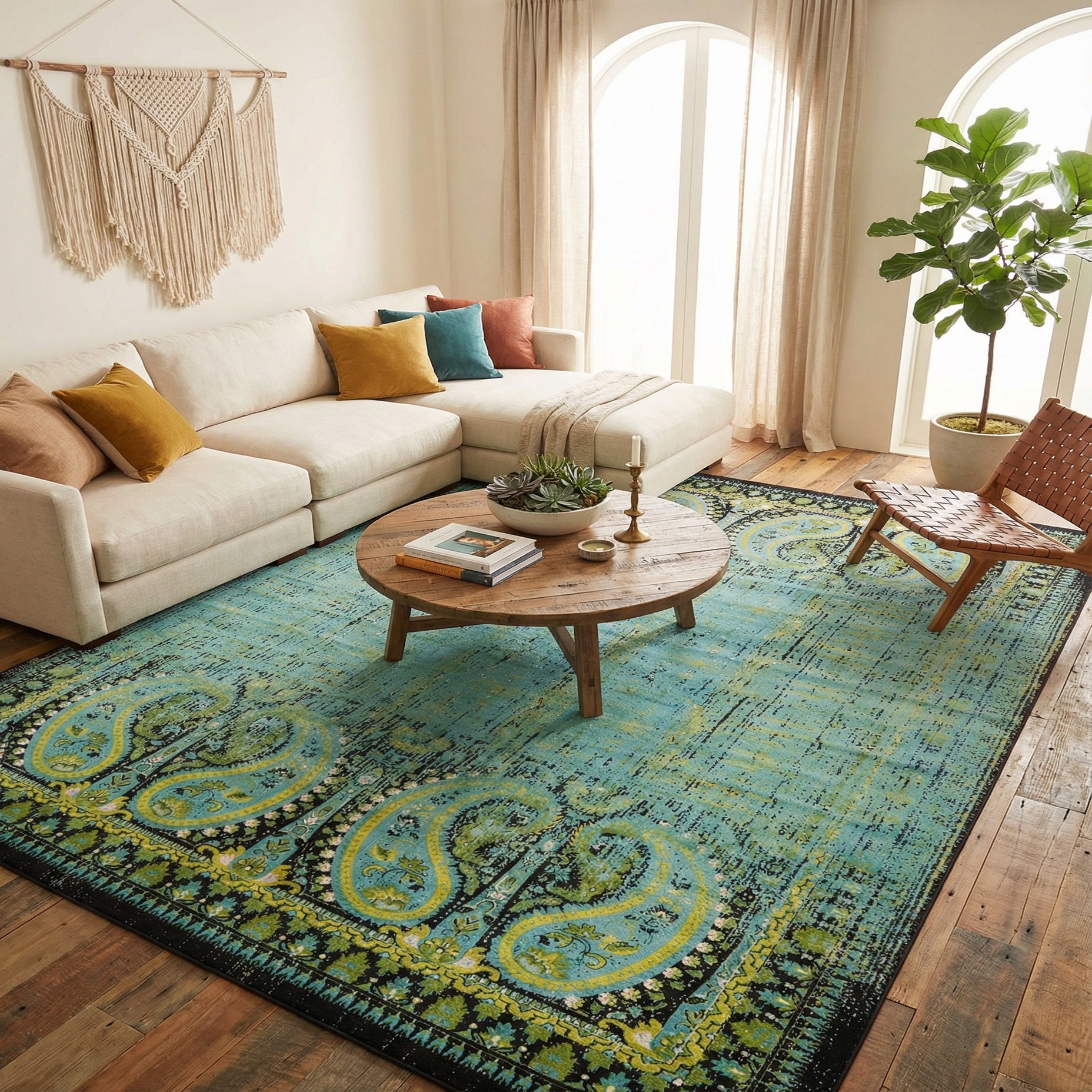 This colorway — aquamarine background with black, green, light green and ivory highlights — pairs well with light wood or painted white furnishings for a fresh, coastal-inspired room, and also complements darker furniture where the black border will anchor a seating group. Use it to define a living room conversation area, place it beneath a rectangular dining table to add color without competing with tableware, or layer it in a relaxed bedroom or sunroom to introduce pattern and depth.