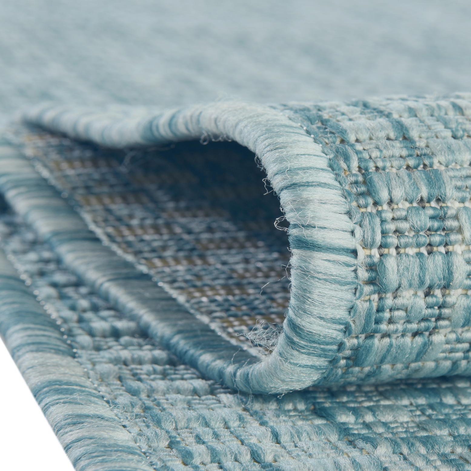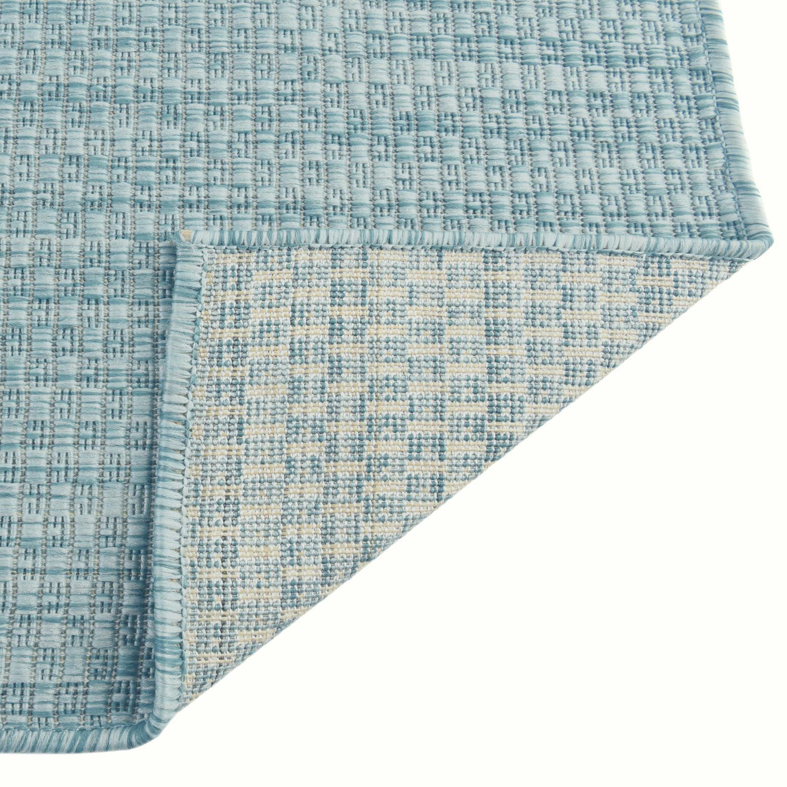 The Outdoor Solid Collection presents a versatile, machine-woven rug crafted from 100% polypropylene, designed to anchor open-air living spaces with ease. Spanning an expansive 13 square feet, this rug's aquamarine background, subtly interwoven with hints of beige, offers a fresh and calming hue reminiscent of tranquil waters.