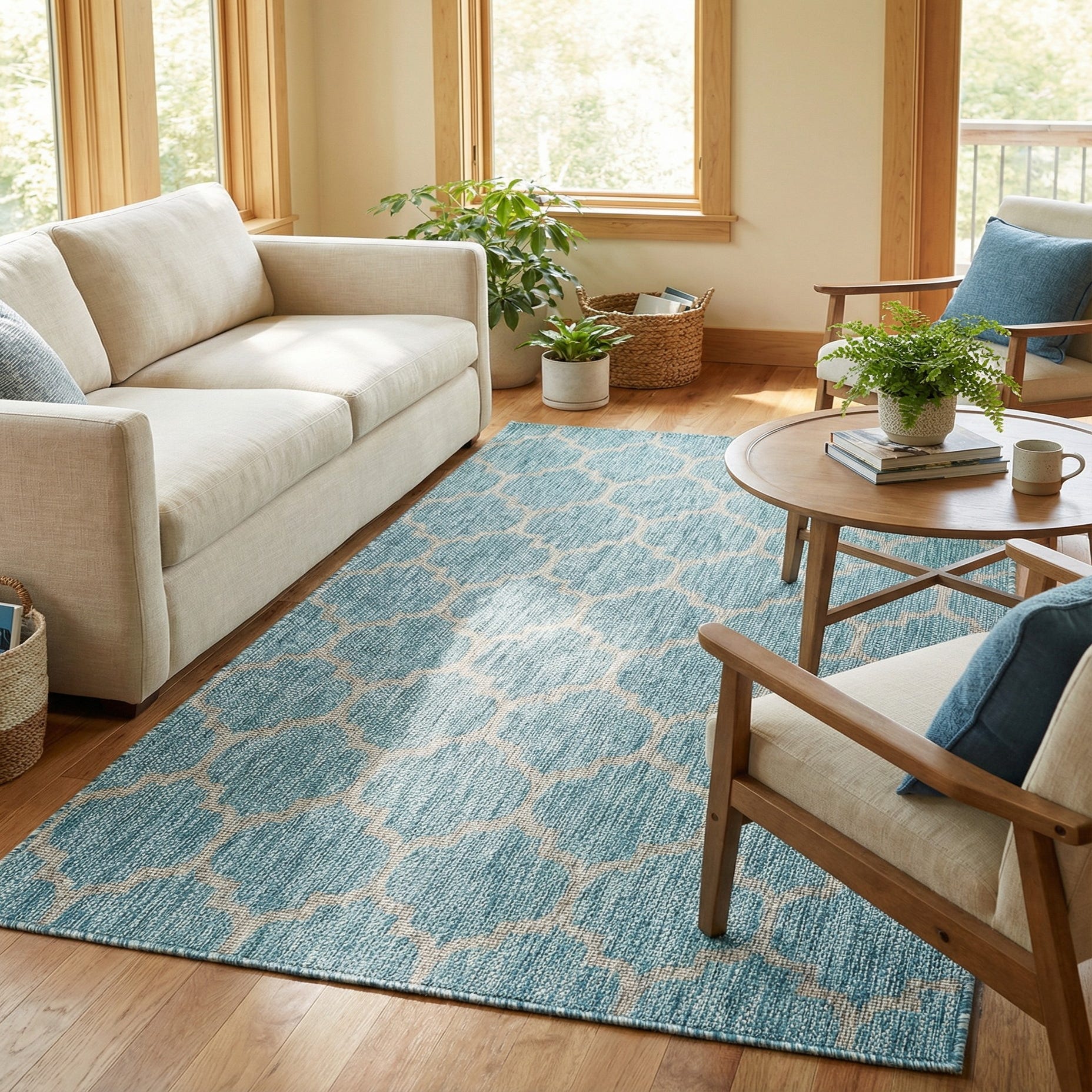This rug works well on a covered patio or sunroom, beneath a casual dining table, or layered in a coastal or transitional living room. Pair it with light woods, white or gray slipcovered seating, and natural wicker or rattan accents for a relaxed, pulled-together look. It also complements navy or coral accent pillows if you want a bolder contrast without changing the room’s cool, breezy palette.