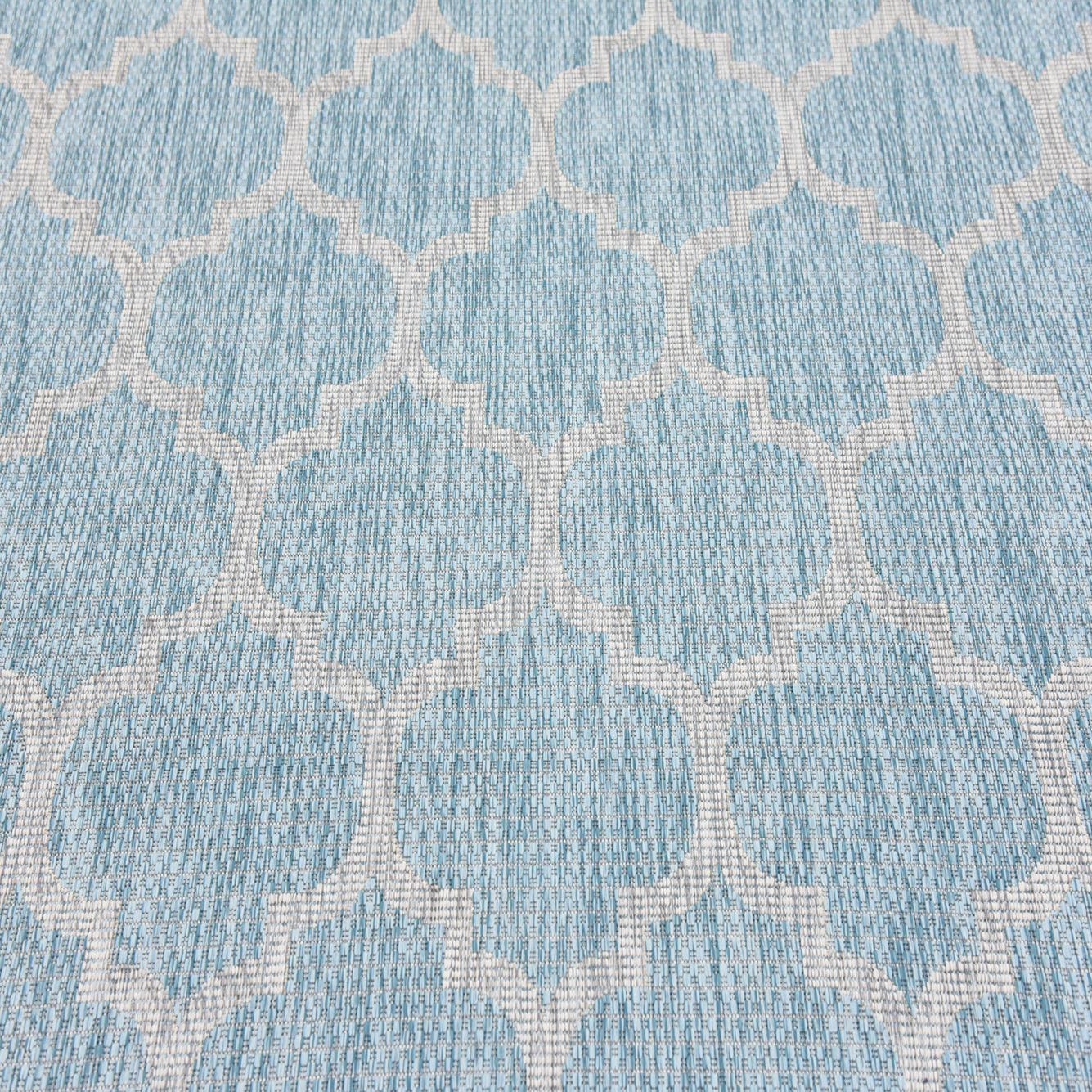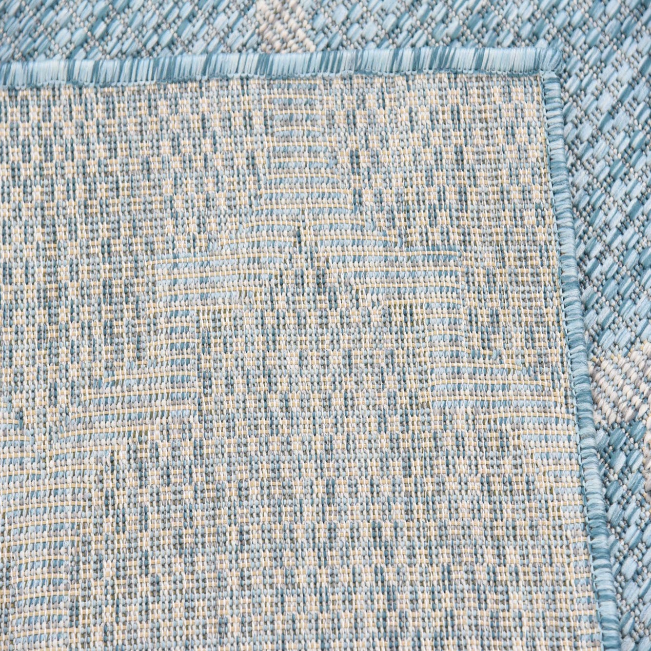 This rug works well on a covered patio or poolside seating area where the aquamarine brings a fresh, watery note, and pairs naturally with whitewashed wood, natural wicker, or brushed-metal furniture. It also suits a casual coastal living room or sunroom—use it to anchor a seating group or define a dining nook for an easygoing, coordinated look.