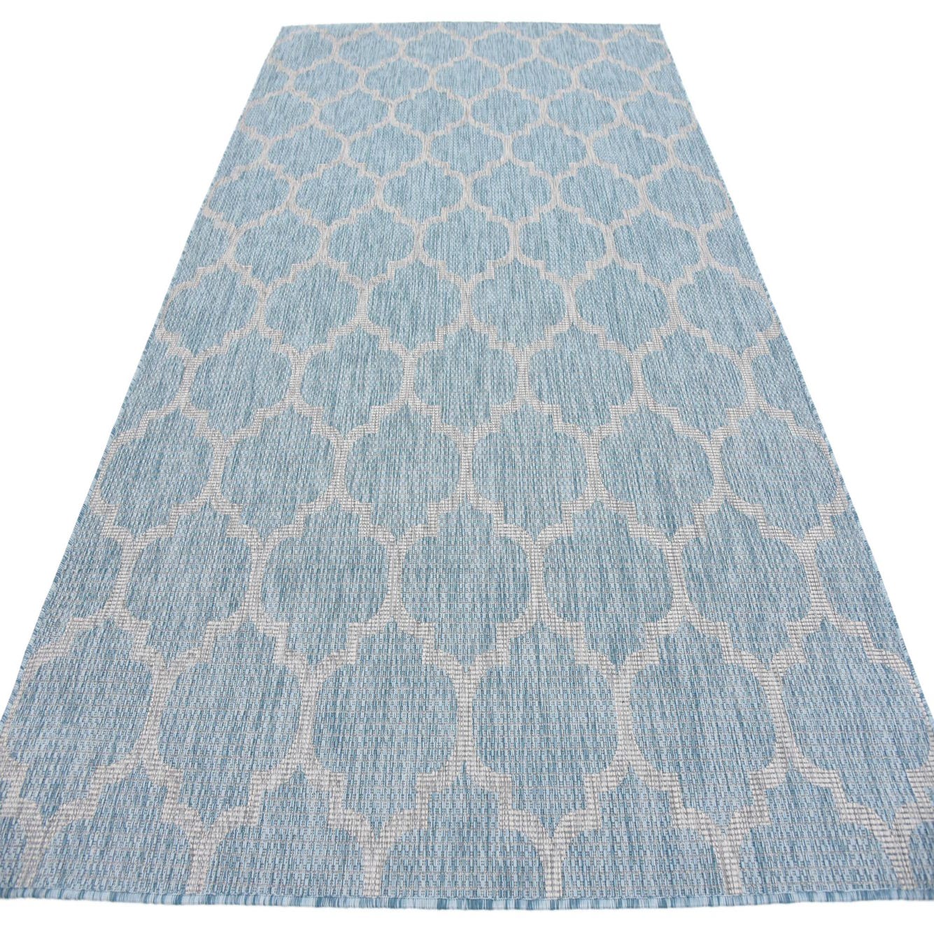 A 6x9 rectangular blue and white trellis pattern rug, suitable for indoor or outdoor spaces like a patio or living room.