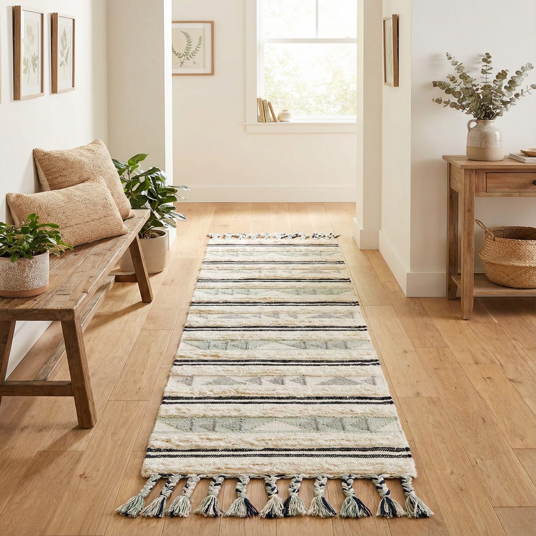 An 8 ft runner rug from the Arizona collection, featuring a modern tribal stripe pattern in blues and cream with braided tassels, ideal for hallways.