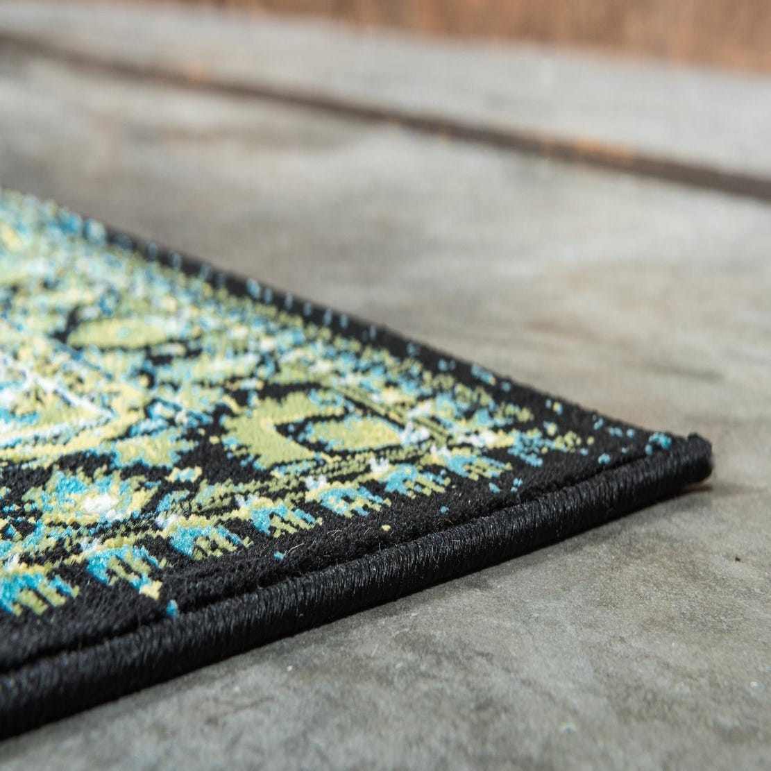 Primary color is Aquamarine. Colors in this rug include: Aquamarine, Black, Green, Light Green, Ivory.