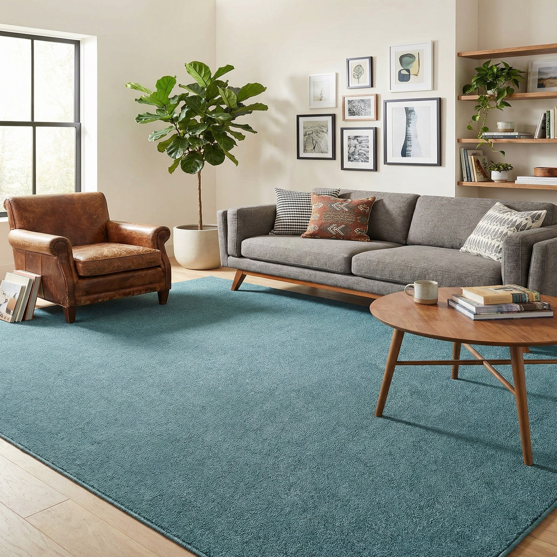 This rug works well as an anchor for a living room seating group or beneath a dining table to introduce color without competing with patterned upholstery. It complements coastal and contemporary schemes — think white linens, light wood tones and brushed metal accents — as well as mid-century modern settings where a single-field color helps balance sculptural furniture. Use it in a bedroom to add a cool, restful layer or in a home office to bring color while keeping the overall look simple and composed.