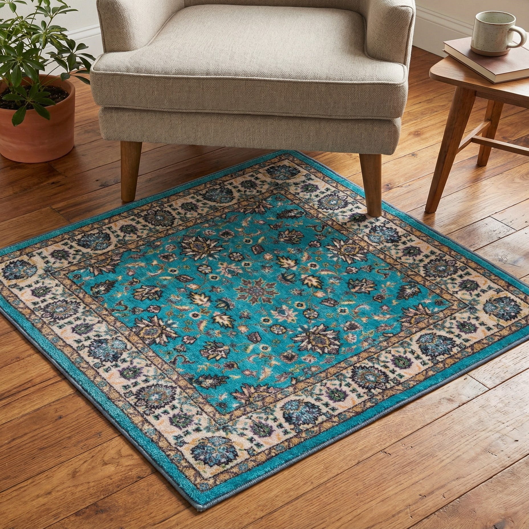 This square rug presents a classic floral medallion layout set against an Arctic Aqua Blue field. Stylized blossoms, leafy vines and small rosettes in black, brown, ivory, olive, yellow and pink repeat across the center while a contrasting ivory border frames the piece with a row of floral motifs. The darker outlines lend definition to the pattern, and the mix of warm and cool tones makes the design easy to coordinate with a variety of palettes.