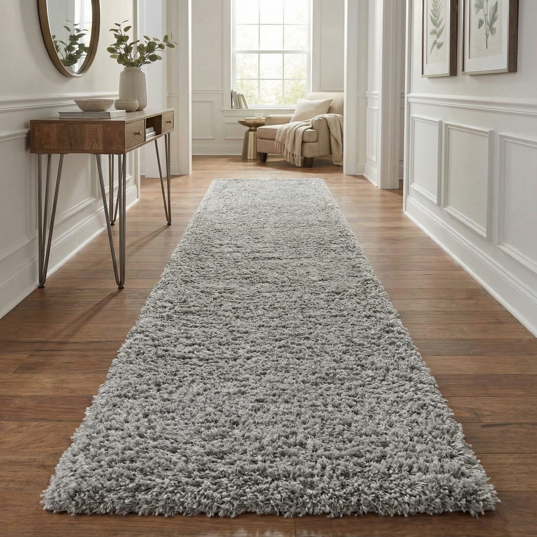 This piece fits naturally in narrow spaces that benefit from added softness — place it in a hallway, alongside a bed, or in front of a console to warm hard floors and soften traffic paths. Its neutral ash hue complements Scandinavian, contemporary, and transitional interiors, and it pairs well with wood tones, metal accents, or layered rugs for a relaxed, lived-in feel.