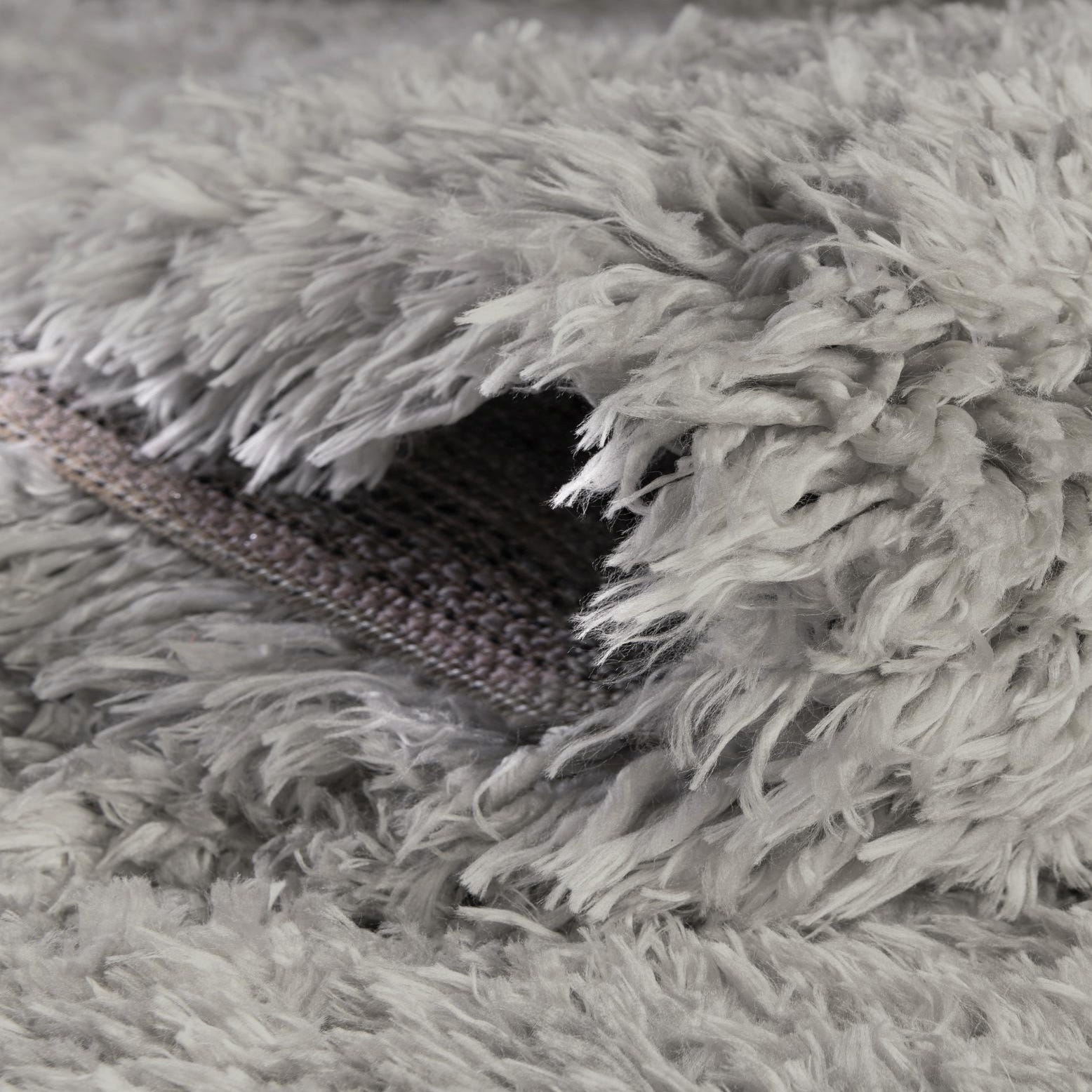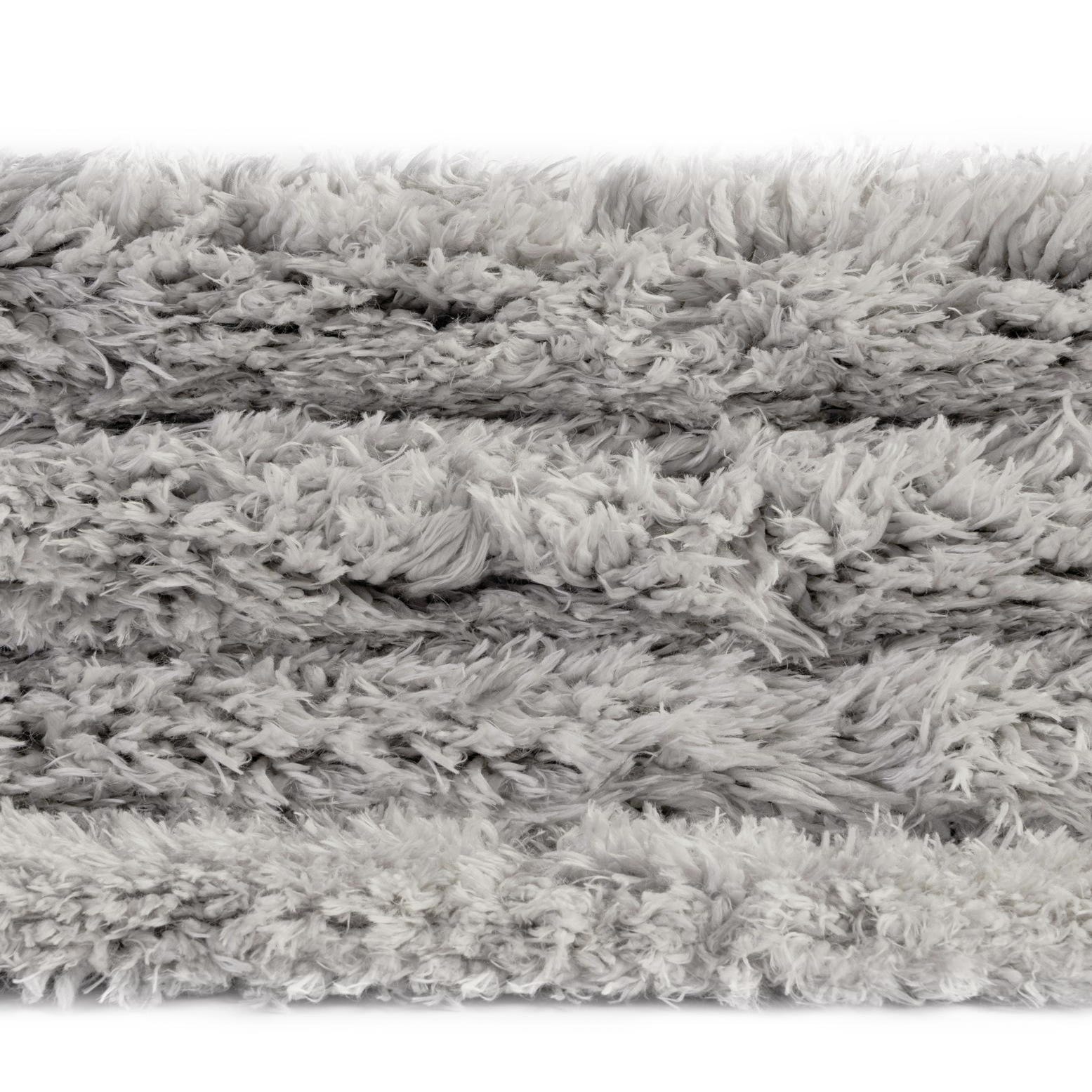 A plush, high-pile shag in a soft ash background, this rug combines a cozy hand with a quiet, modern pattern. Variations in pile direction create a low-contrast geometric block effect across the surface, giving the rug tactile depth and visual interest without loud color or busy motifs. Machine made from 100% polyester, the dense fibers have a supple, cushiony feel underfoot and a gently lustrous finish that enhances the ash tone.
