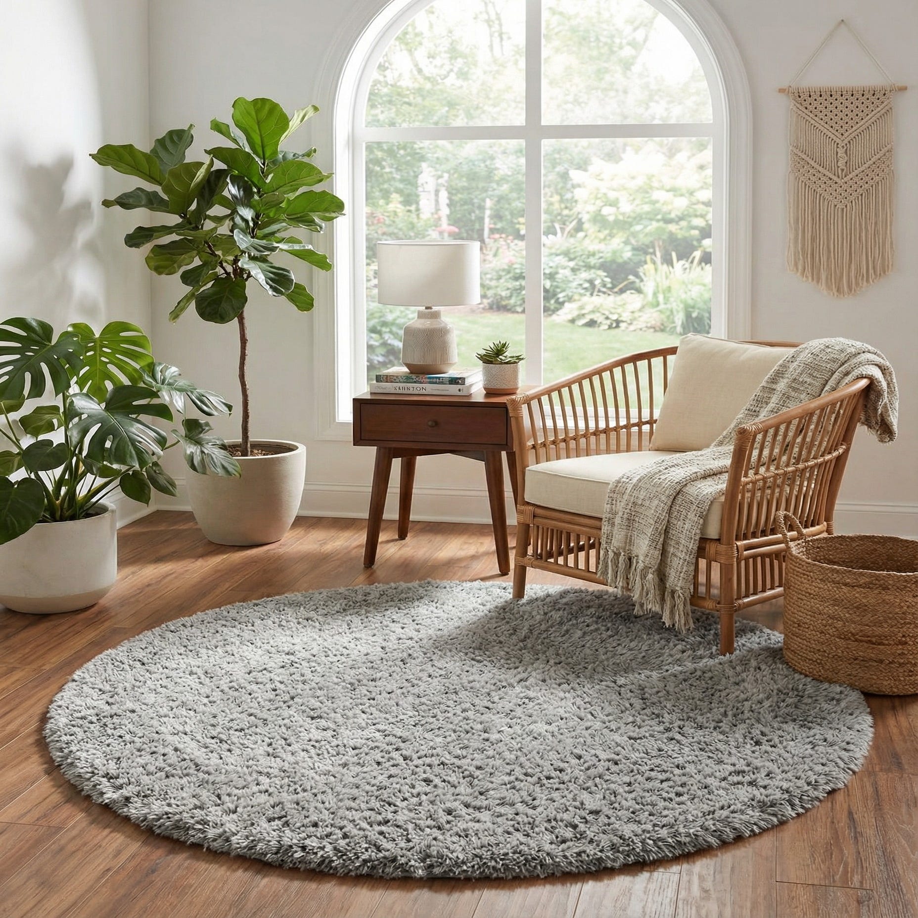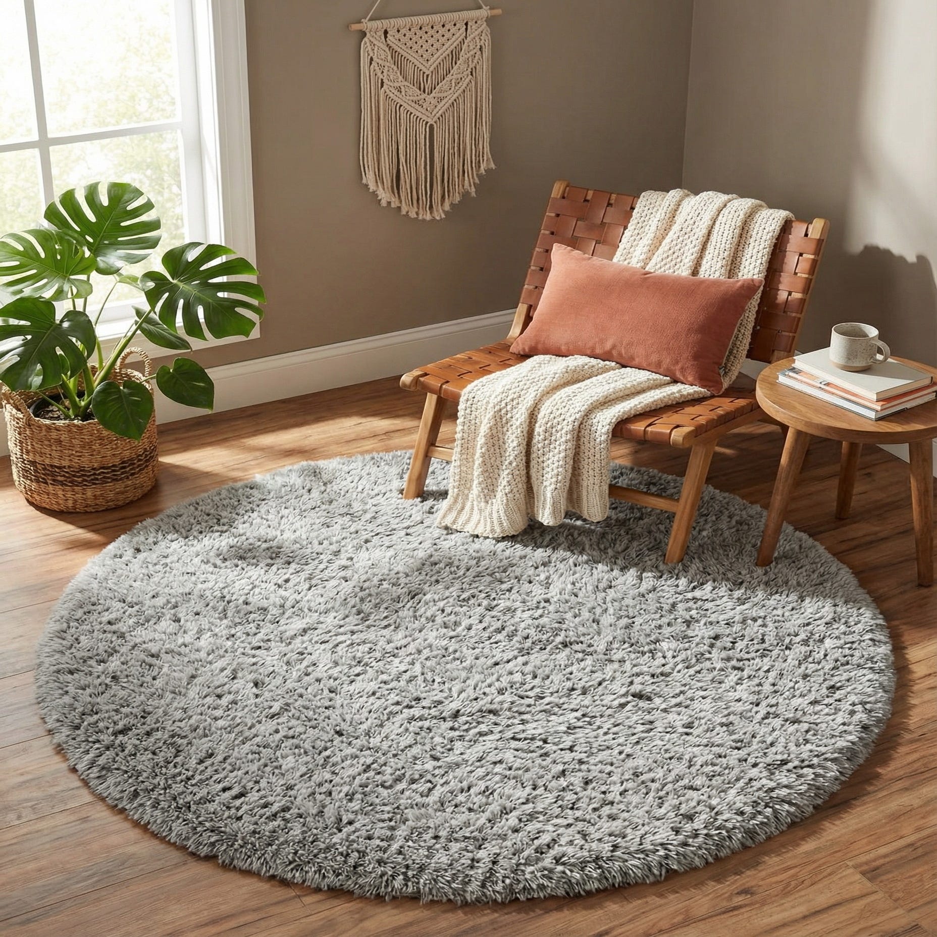 A low-key, round shag in a soft ash tone that adds texture without a busy pattern. The surface is a dense, long-pile polyester shag that invites bare feet—plush and slightly lustrous with subtle tonal variation from the pile’s movement. Its overall effect is minimalist and tactile rather than patterned, making the color and texture the focal points.