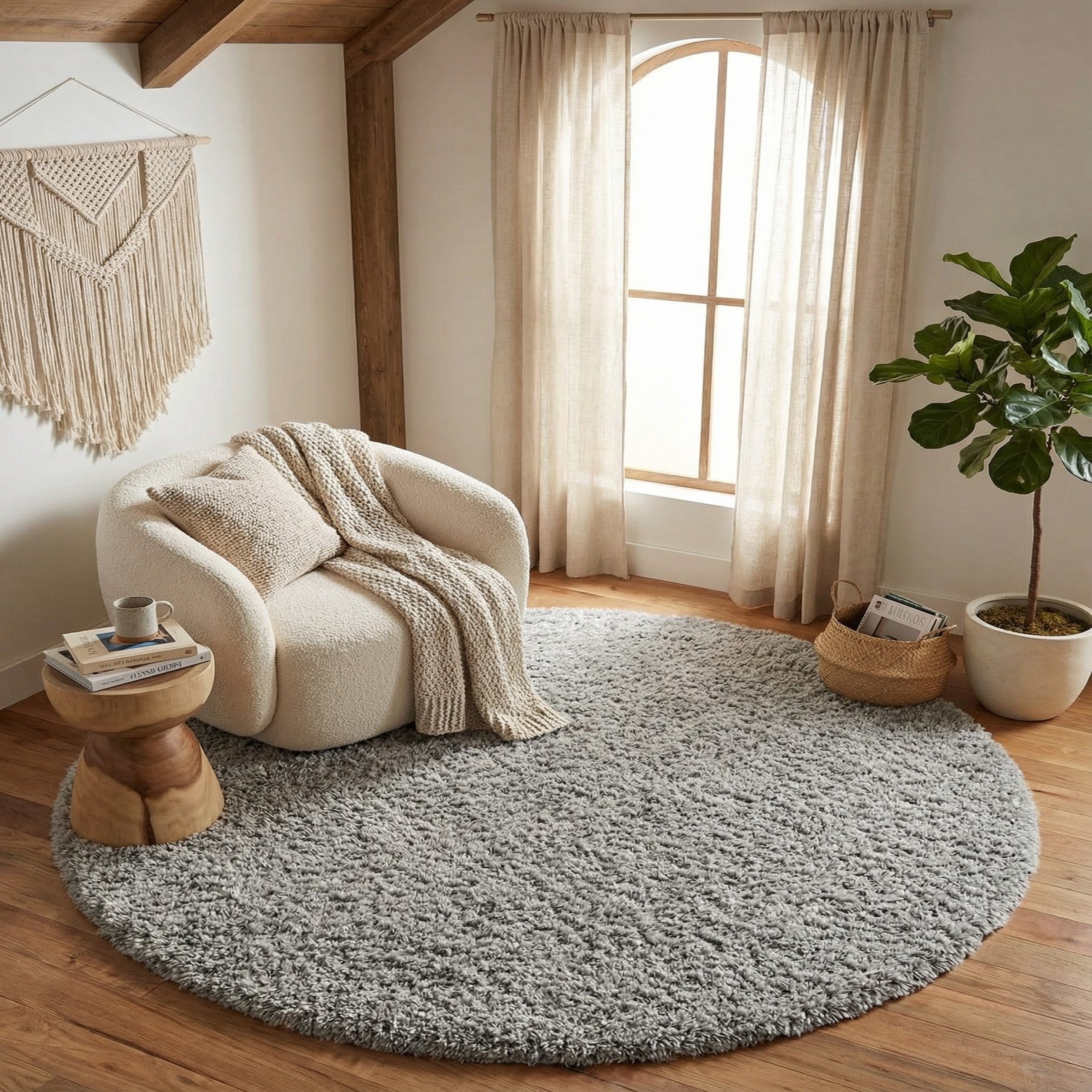 A round shag in a soft ash gray that offers a calm, neutral foundation for any room. The design is clean and solid with no pattern, letting the long, dense polyester fibers create visual interest through subtle tonal shifts and a gentle sheen. Running your hand across the surface reveals a plush, velvety texture and a deep pile that feels cushioned and inviting beneath bare feet.