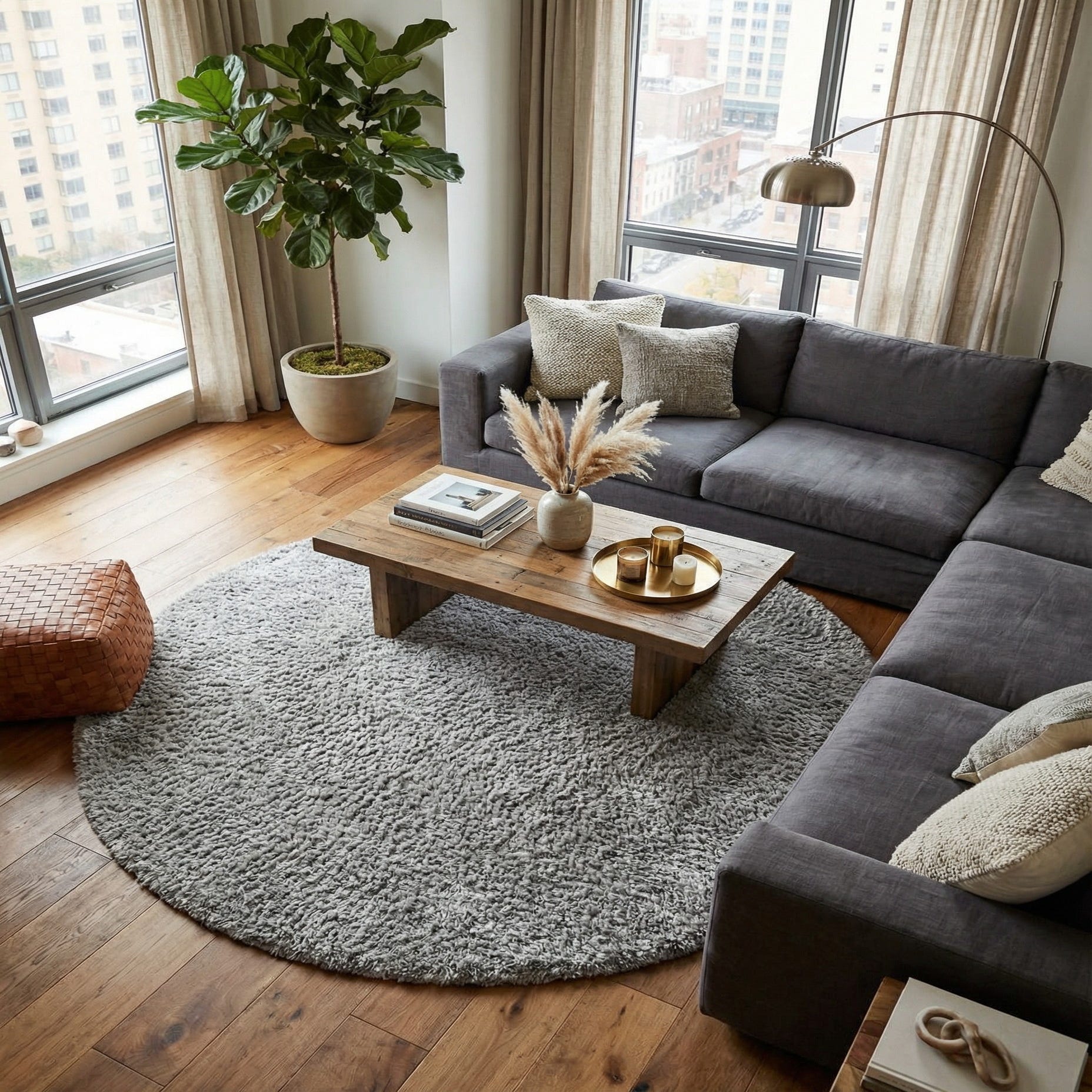 The simple, monochromatic style works well in contemporary and Scandinavian interiors where a neutral anchor is needed, or in a minimalist bedroom to soften hard edges and introduce warmth. It also pairs nicely with light-wood furniture, sleek metal accents, or layered over a flatweave for a textured contrast in a living room or reading nook. The machine-made construction and polyester pile make it a practical choice for everyday spaces that benefit from a consistent, comfortable surface.
