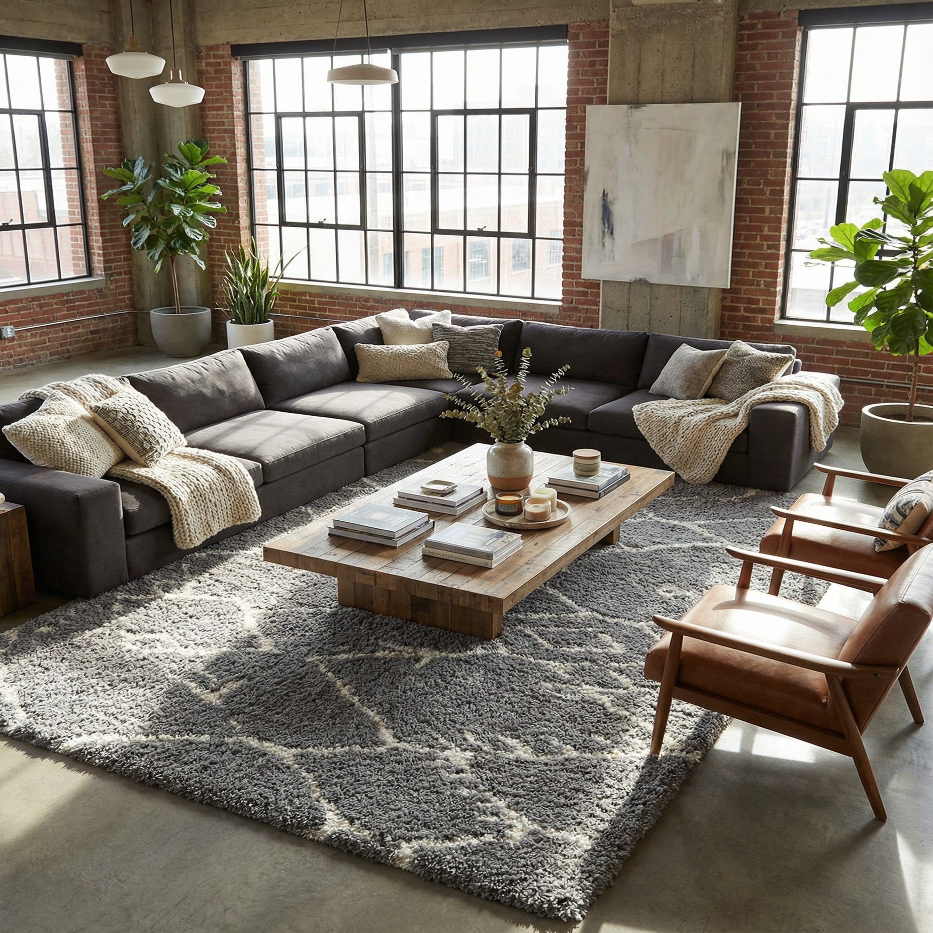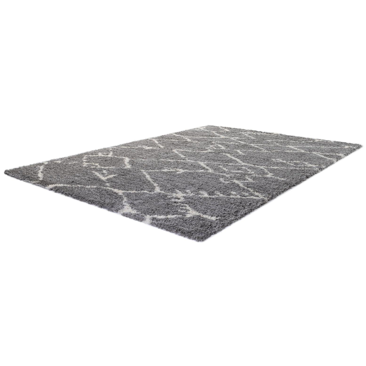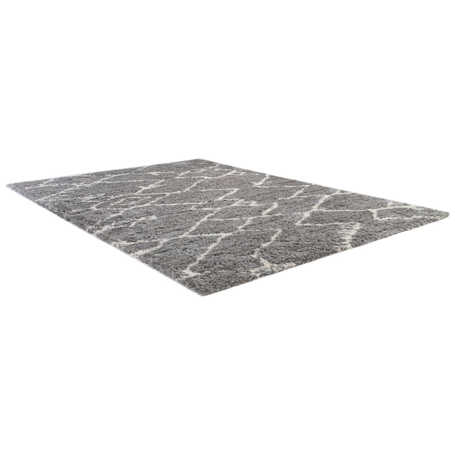 A large 10x14 rectangular gray shag rug with a modern white geometric diamond pattern, suitable for an indoor living space.