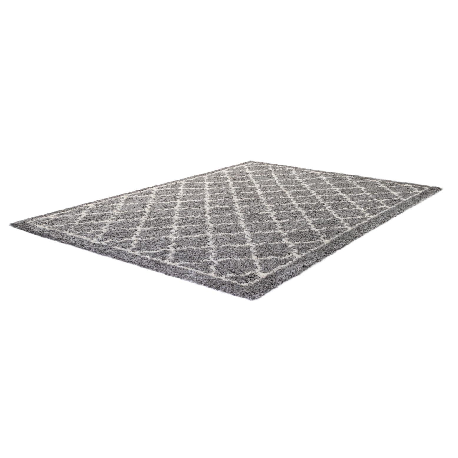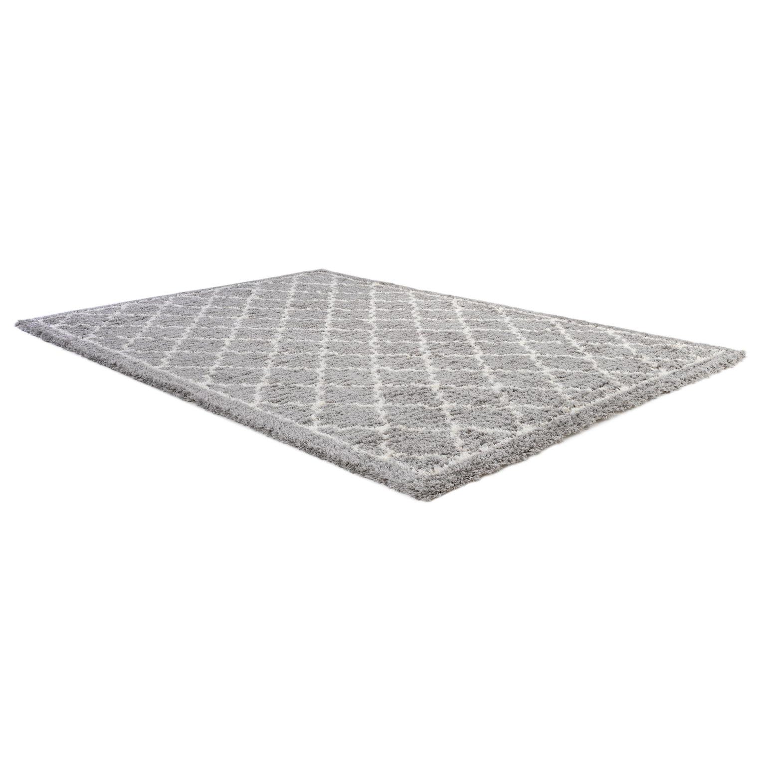A large 10x14 rectangular gray shag rug with a white modern geometric trellis pattern, suitable for a living room.