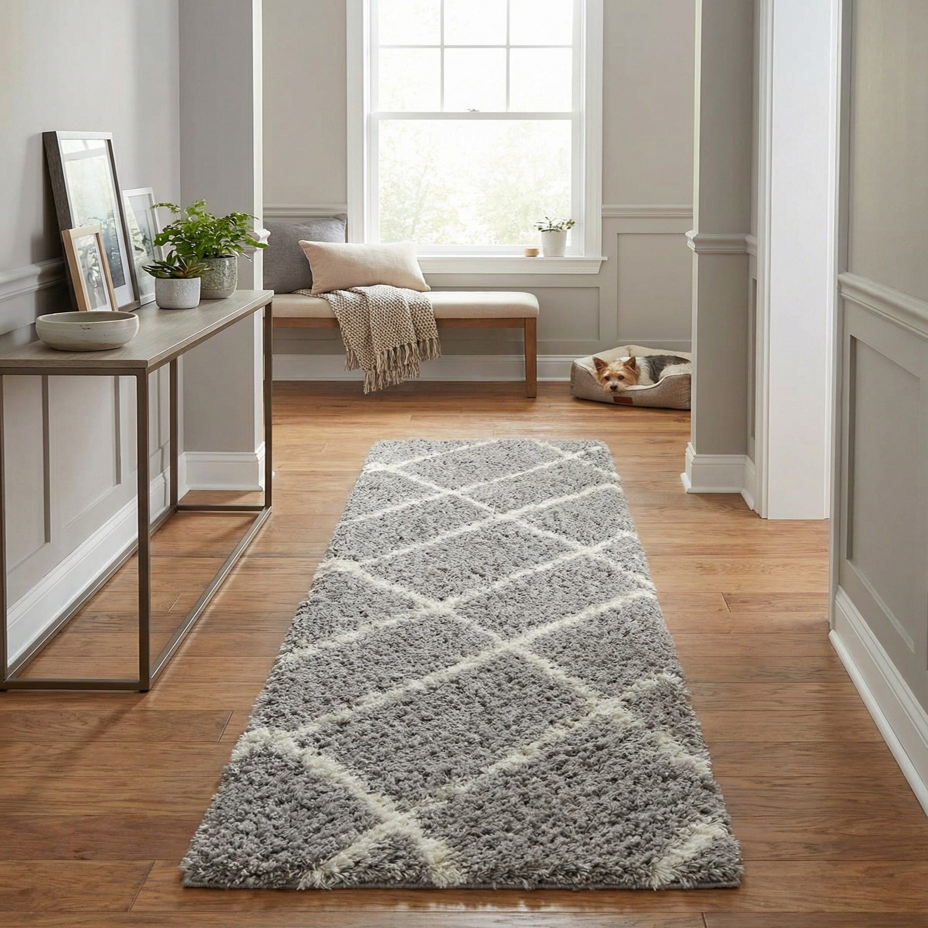 A 12 ft gray runner rug with a modern off-white diamond pattern, featuring a plush shag pile.