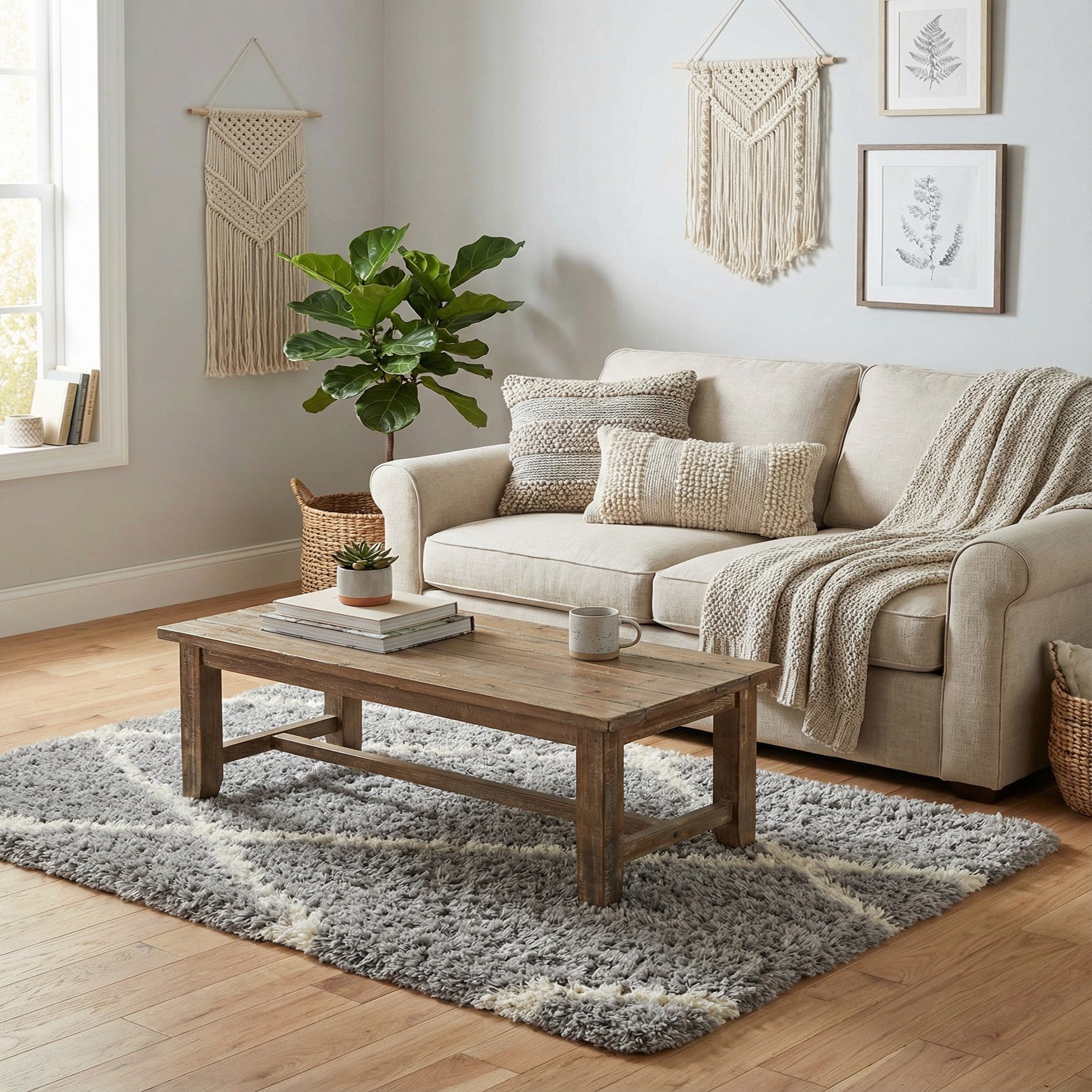 A 3x5 rectangular gray shag rug with a modern geometric diamond pattern in off-white, shown from above.
