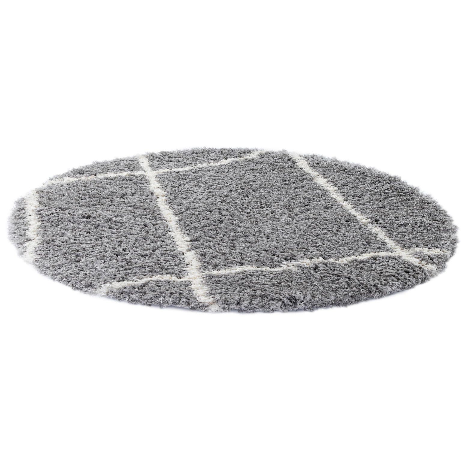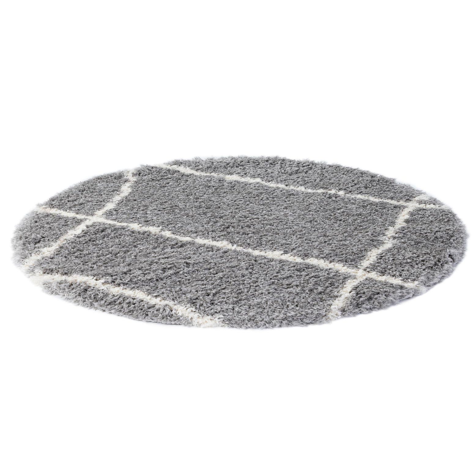 A 5' round gray shag rug with a modern white grid pattern, perfect for adding softness to any indoor space.