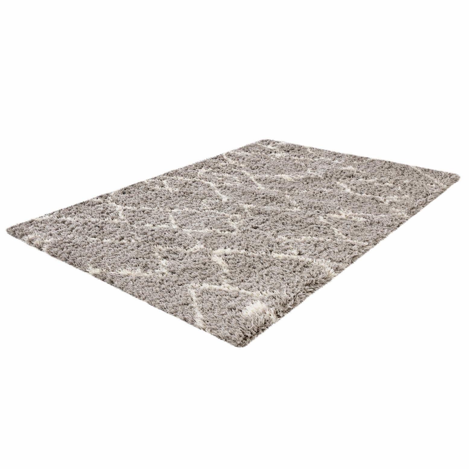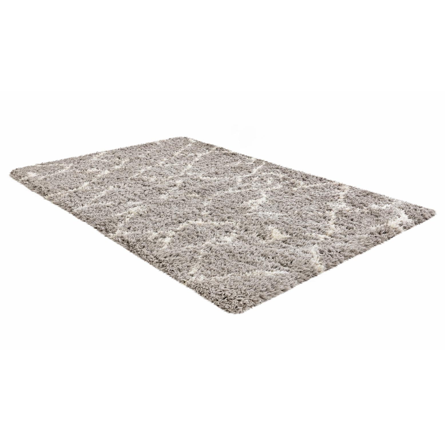 A 5x8 rectangular gray shag rug with a modern white geometric pattern, perfect for a living room.
