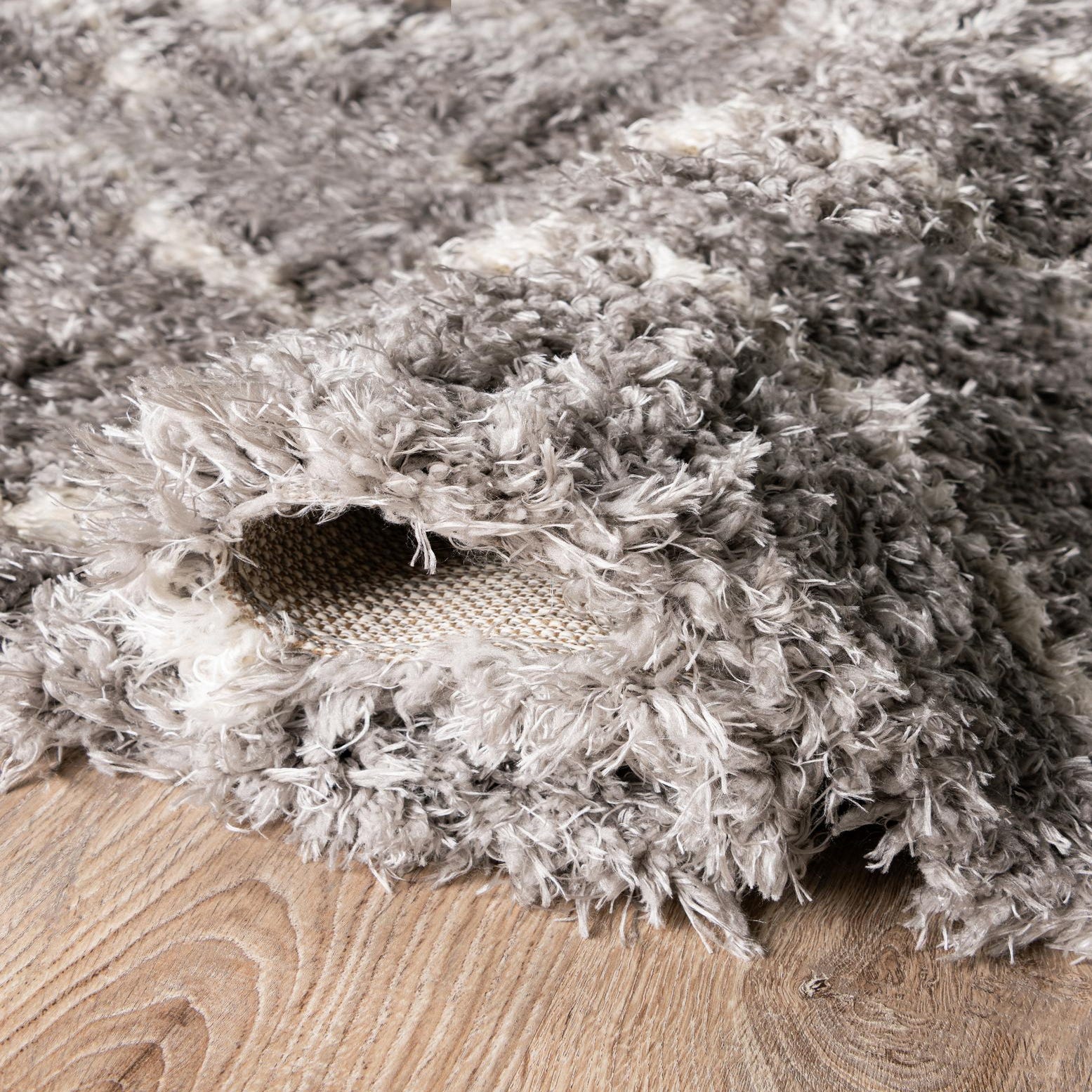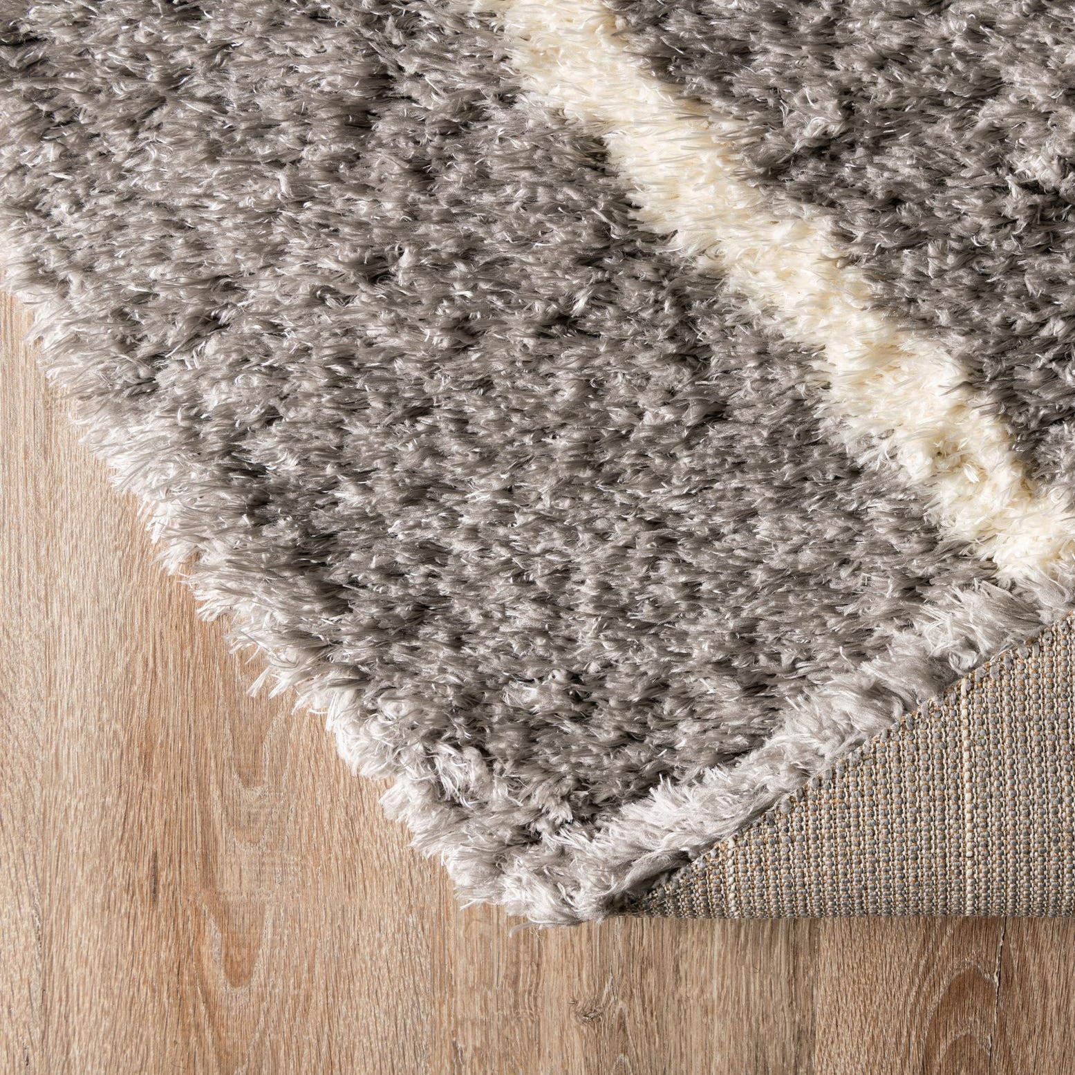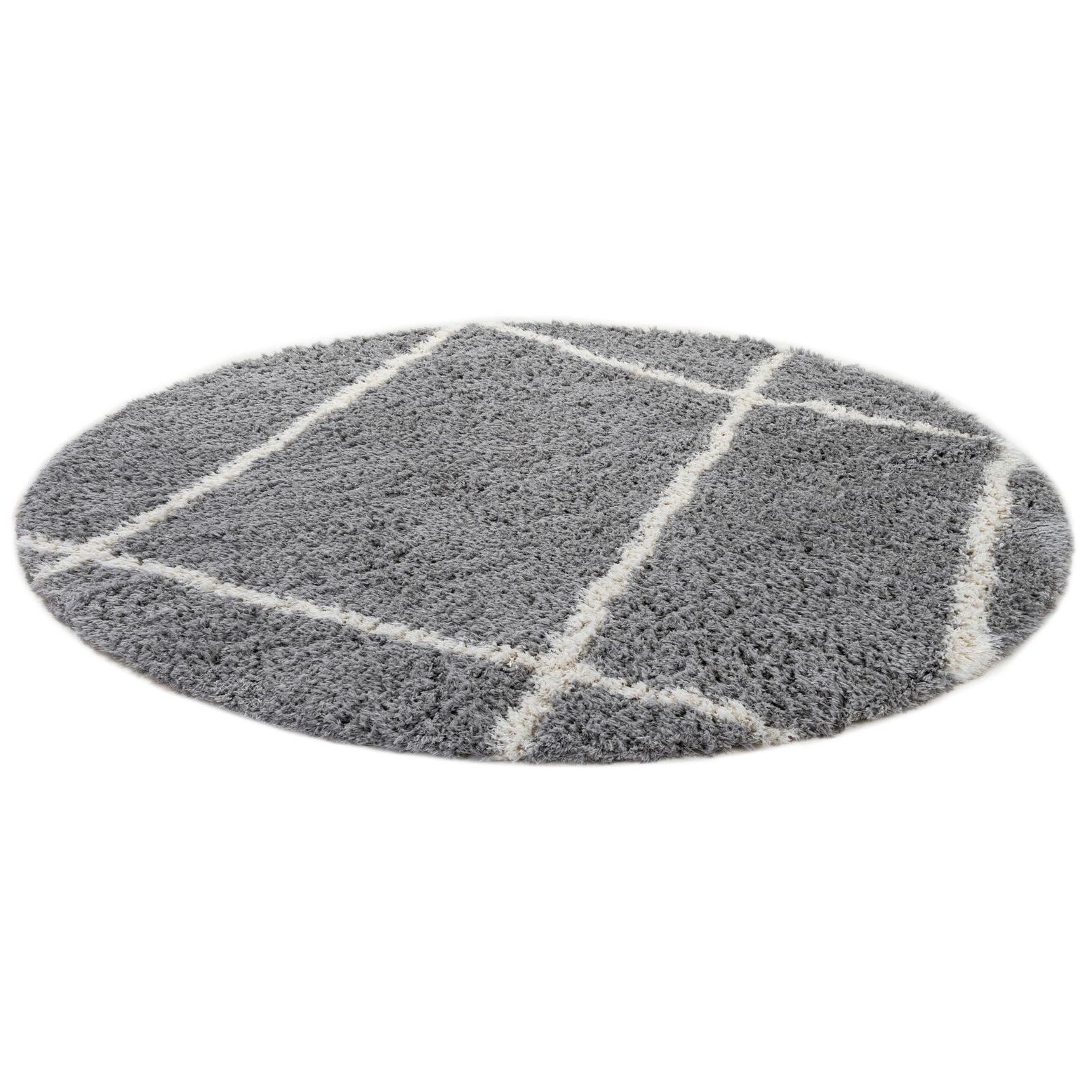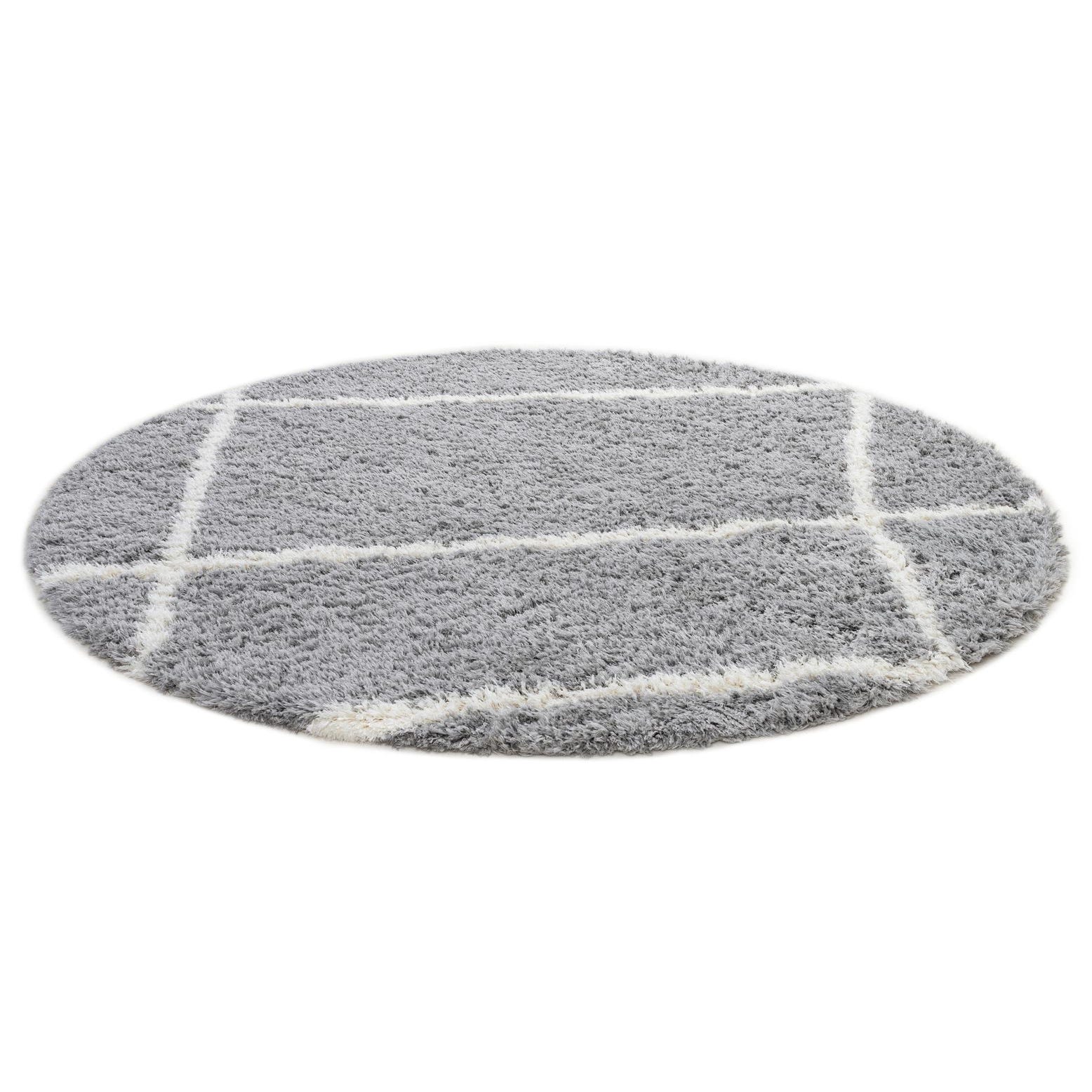 A round, gray shag rug with a modern white crisscross pattern, perfect for adding texture to an indoor space.