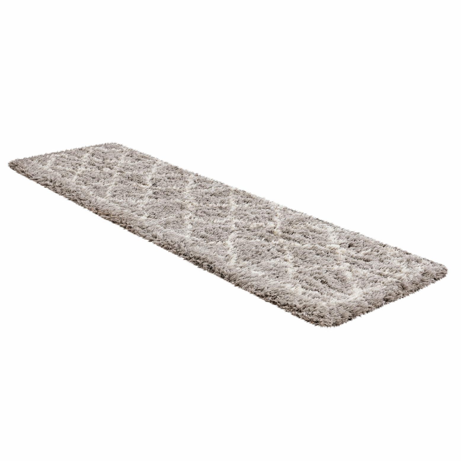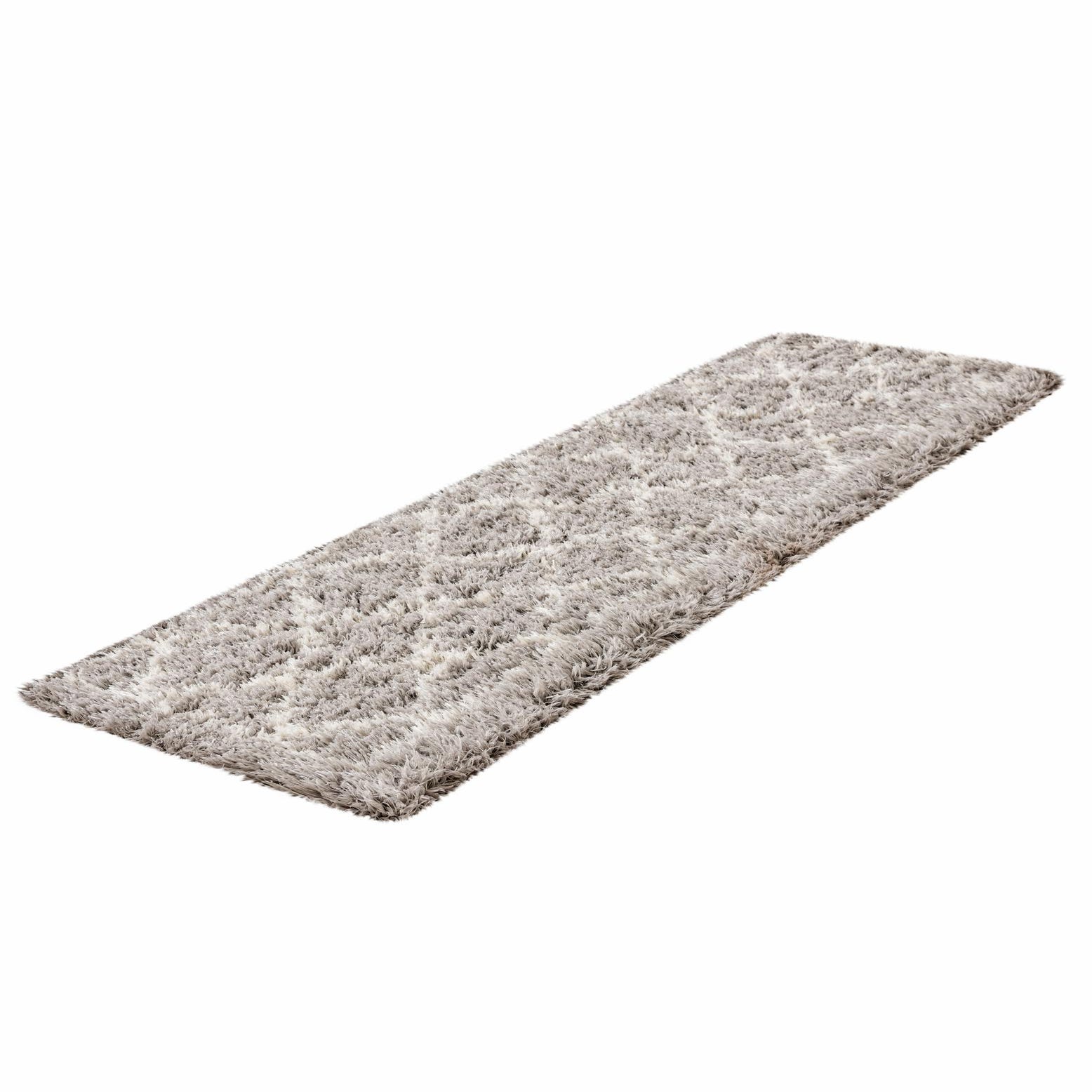 A gray and silver 8 ft runner rug with a modern shag pattern, suitable for a hallway.