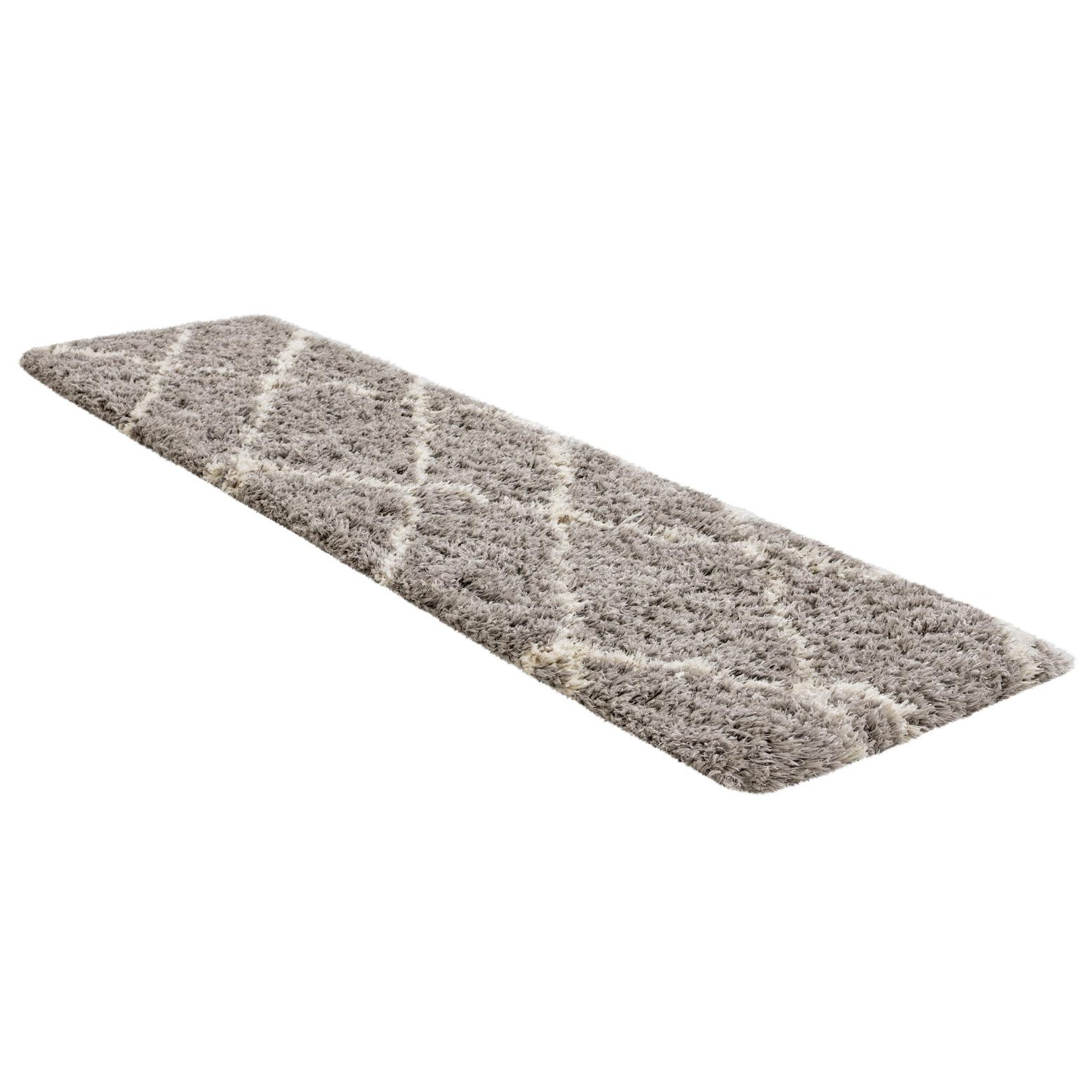 A gray shag runner rug with a modern white geometric diamond pattern, perfect for a hallway.