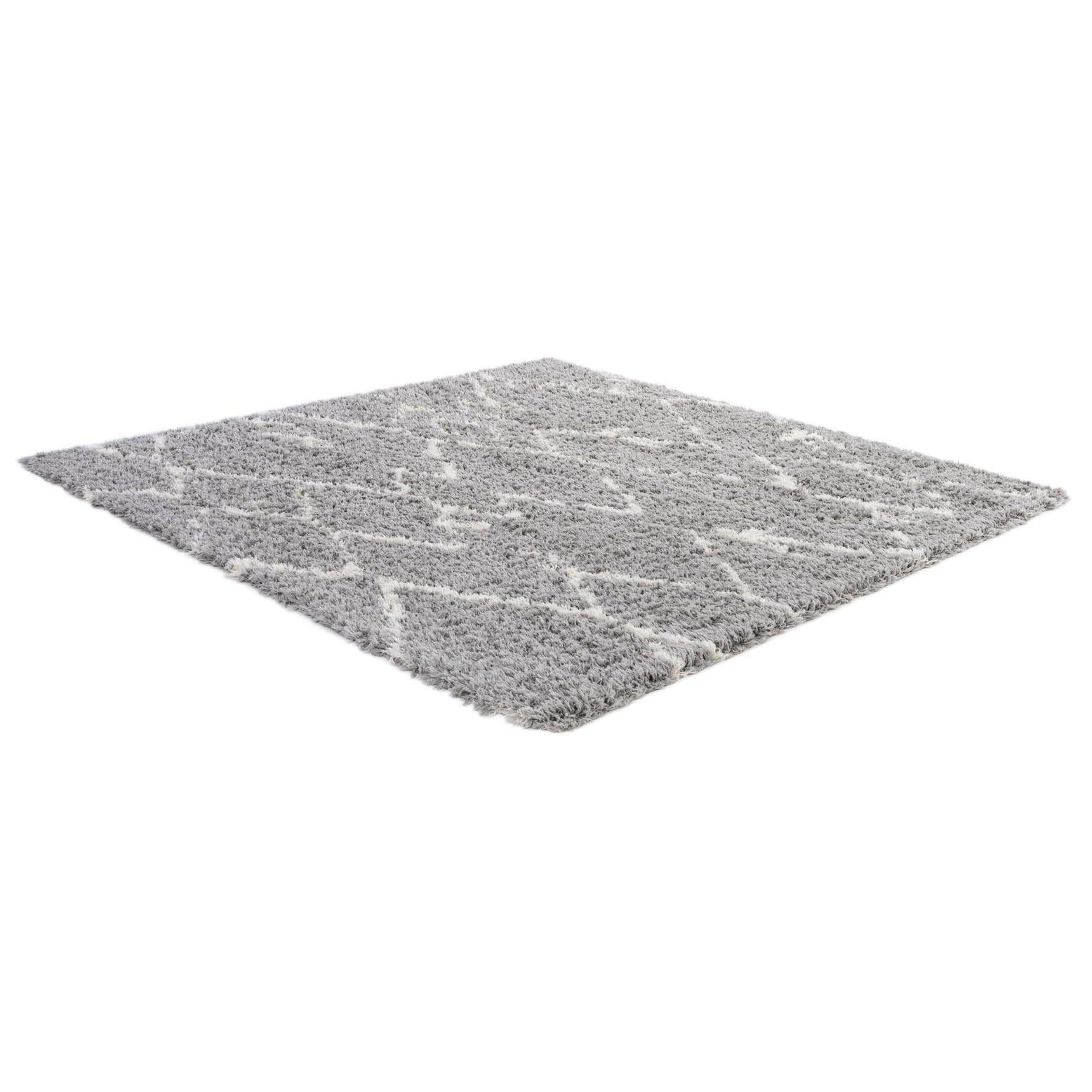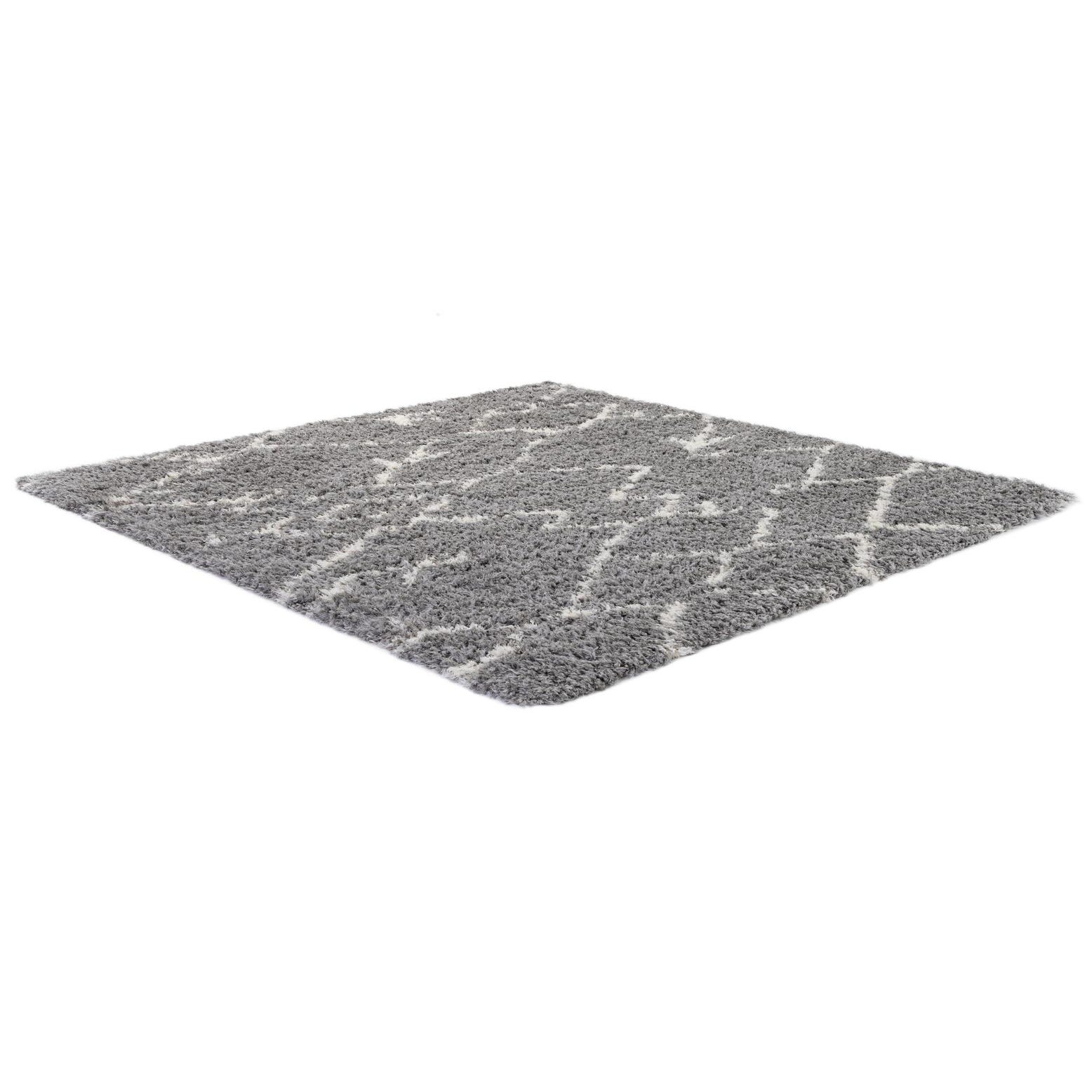 A square gray shag area rug with a modern white geometric trellis pattern, suitable for a living room or bedroom.