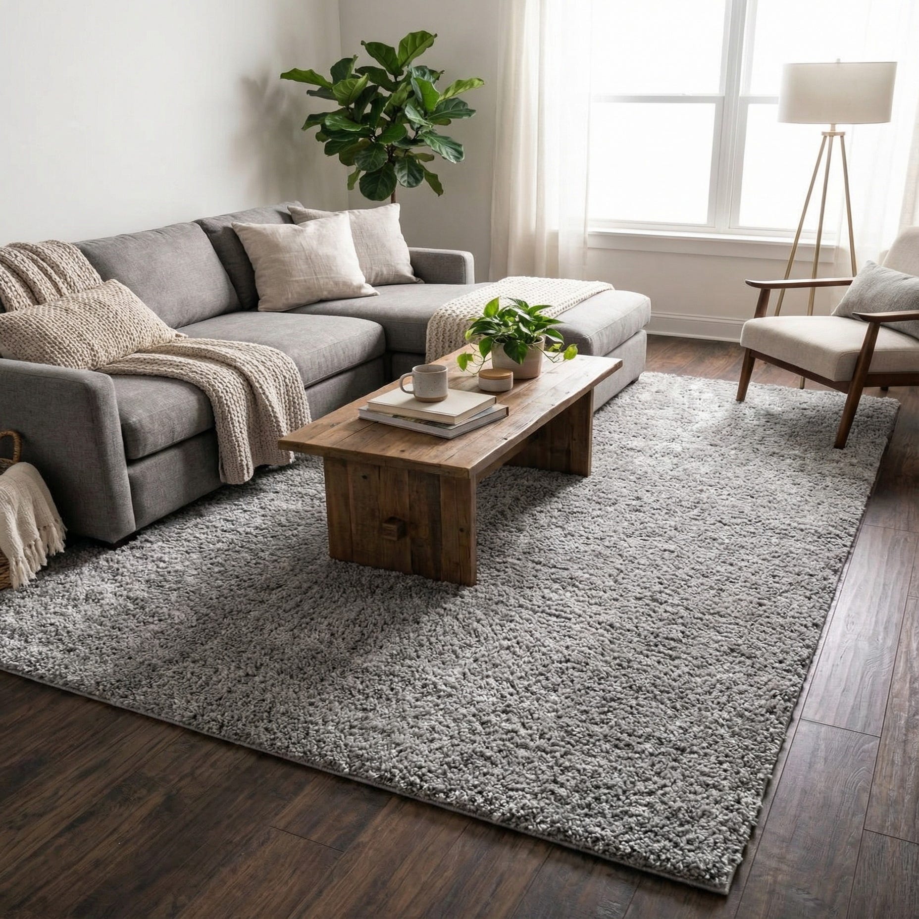 A large 8x10 rectangular gray shag rug with a textured, modern solid pattern, ideal for a living room.