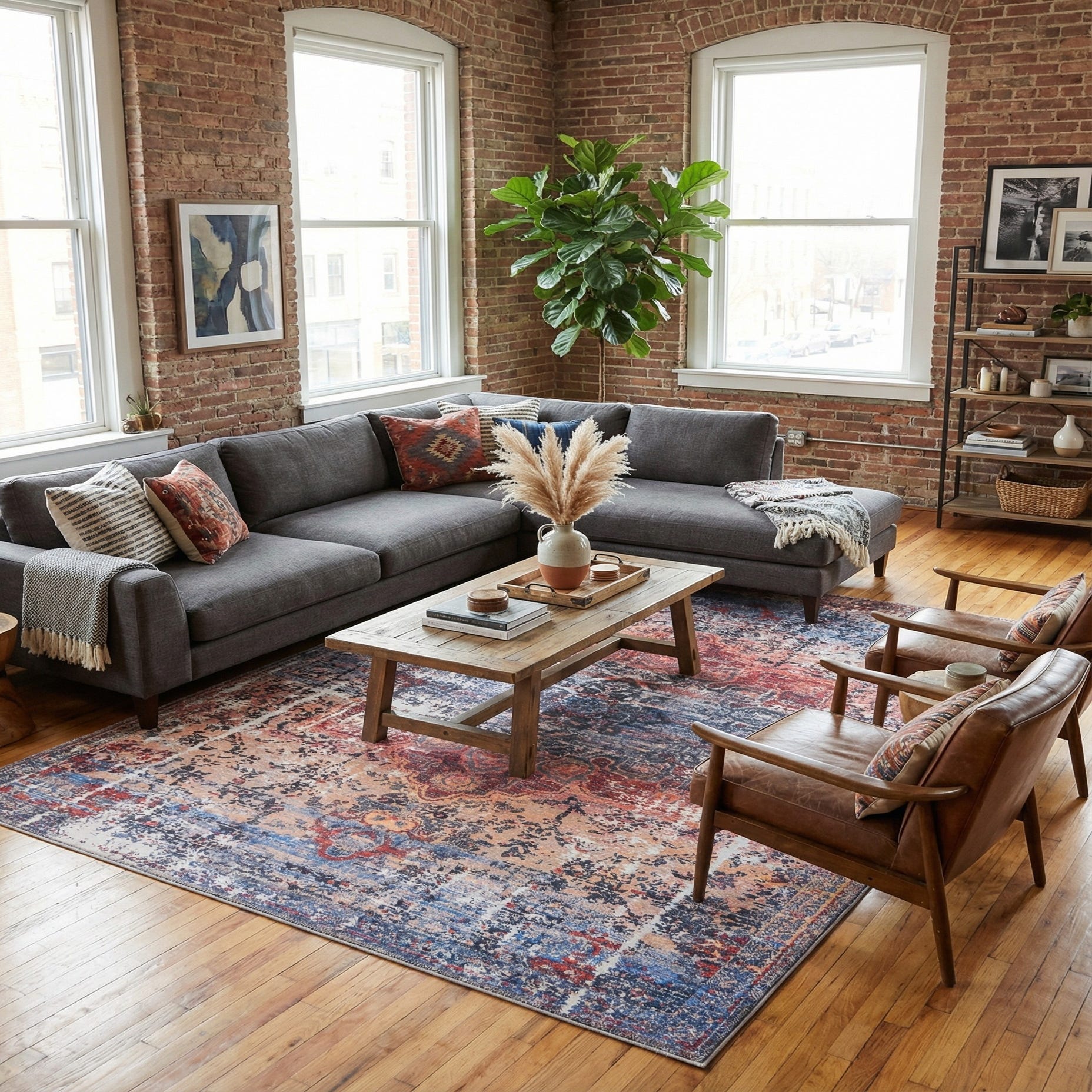 This rug works well as an anchor for a seating area or beneath a dining table, and it pairs naturally with warm wood furniture, neutral upholstery, and mixed-metal accents. Place it in a transitional living room with a linen sofa and walnut coffee table, a boho bedroom layered with textured pillows and woven baskets, or an eclectic family room with leather seating and matte-black fixtures to balance the color and pattern.