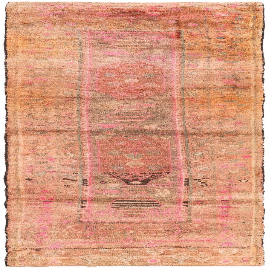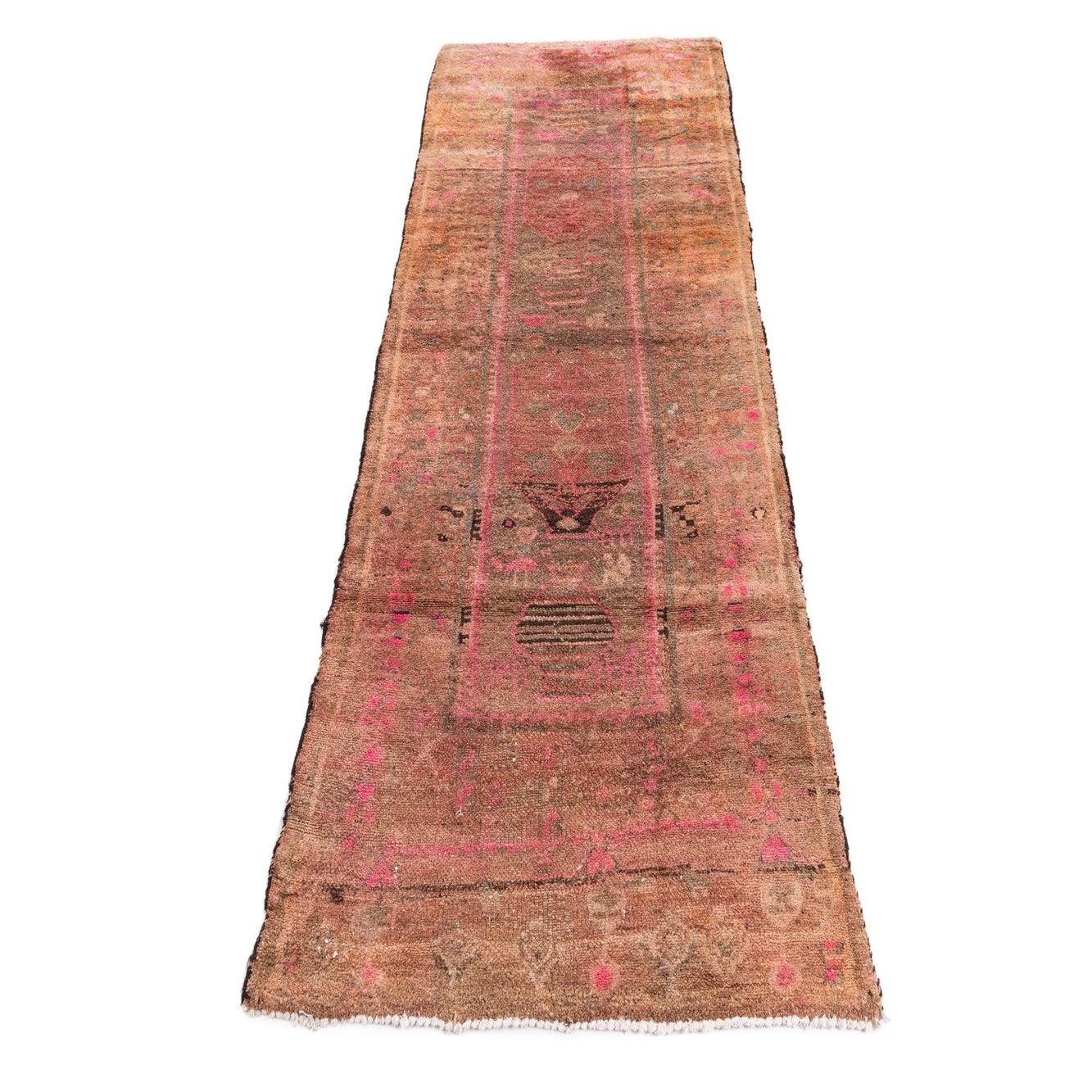 Hand-knotted from 100% wool, this runner combines a softly faded vintage pattern with a tactile, slightly plush pile. A narrow central field holds a procession of geometric medallions and small tribal motifs, framed by a muted border that enhances the rug’s lived-in look. The background is warm brown, lifted by coral-pink and rust accents that appear gently overdyed across the surface. Running your hand over the wool reveals a dense, comforting texture with subtle variations in pile that catch the light and emphasize the rug’s layered coloration.