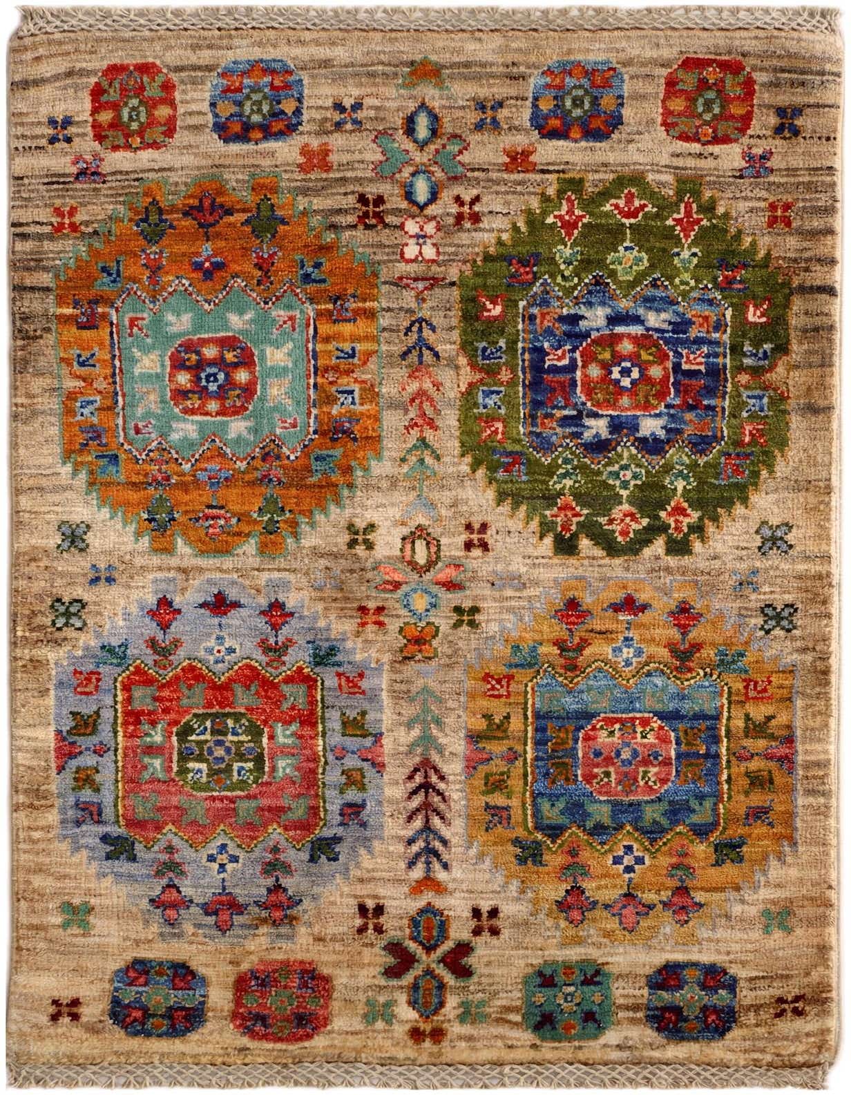 Primary color is Baige. Colors in this rug include: Baige, Green, Red, Navy Blue, Grey, Gold, Rust Red.