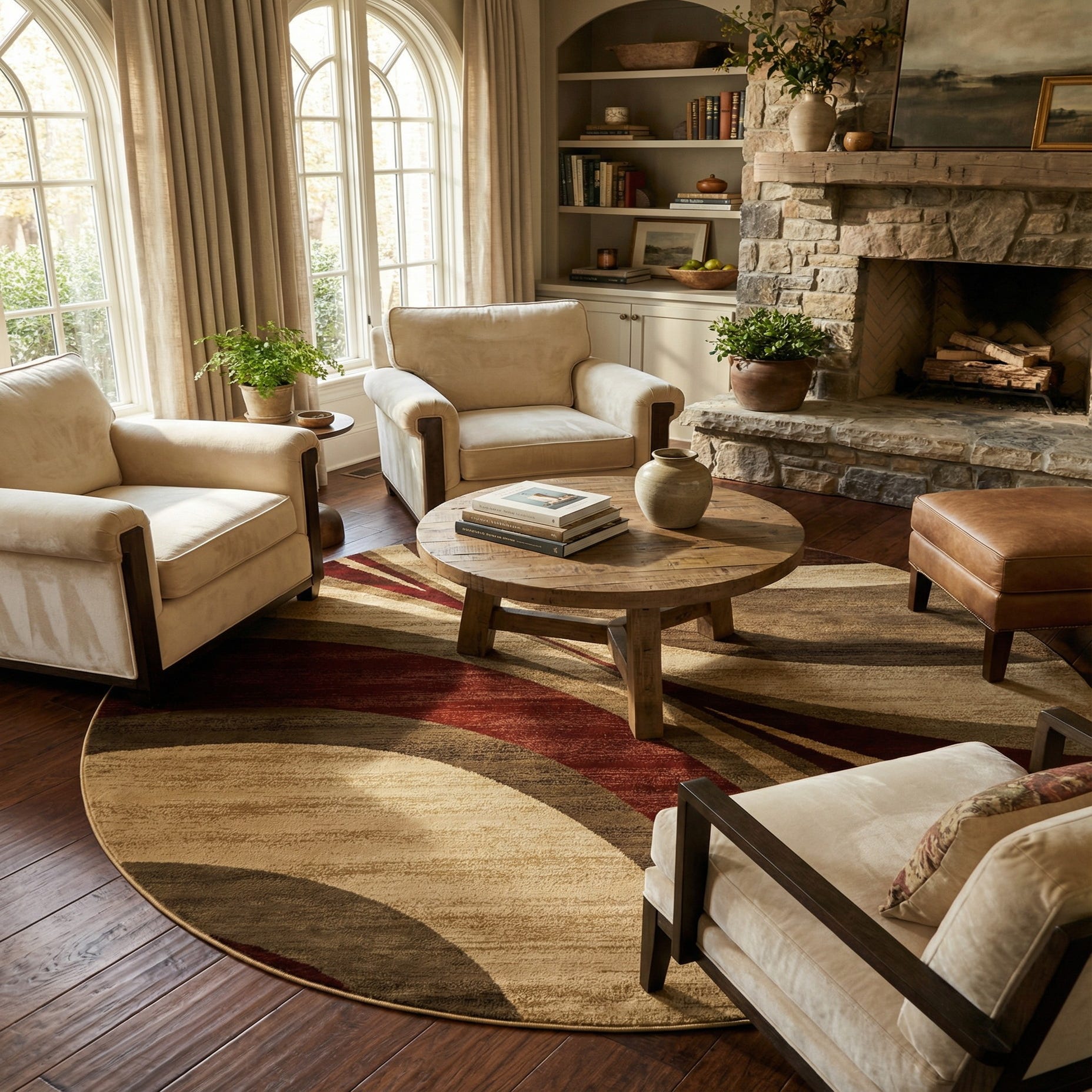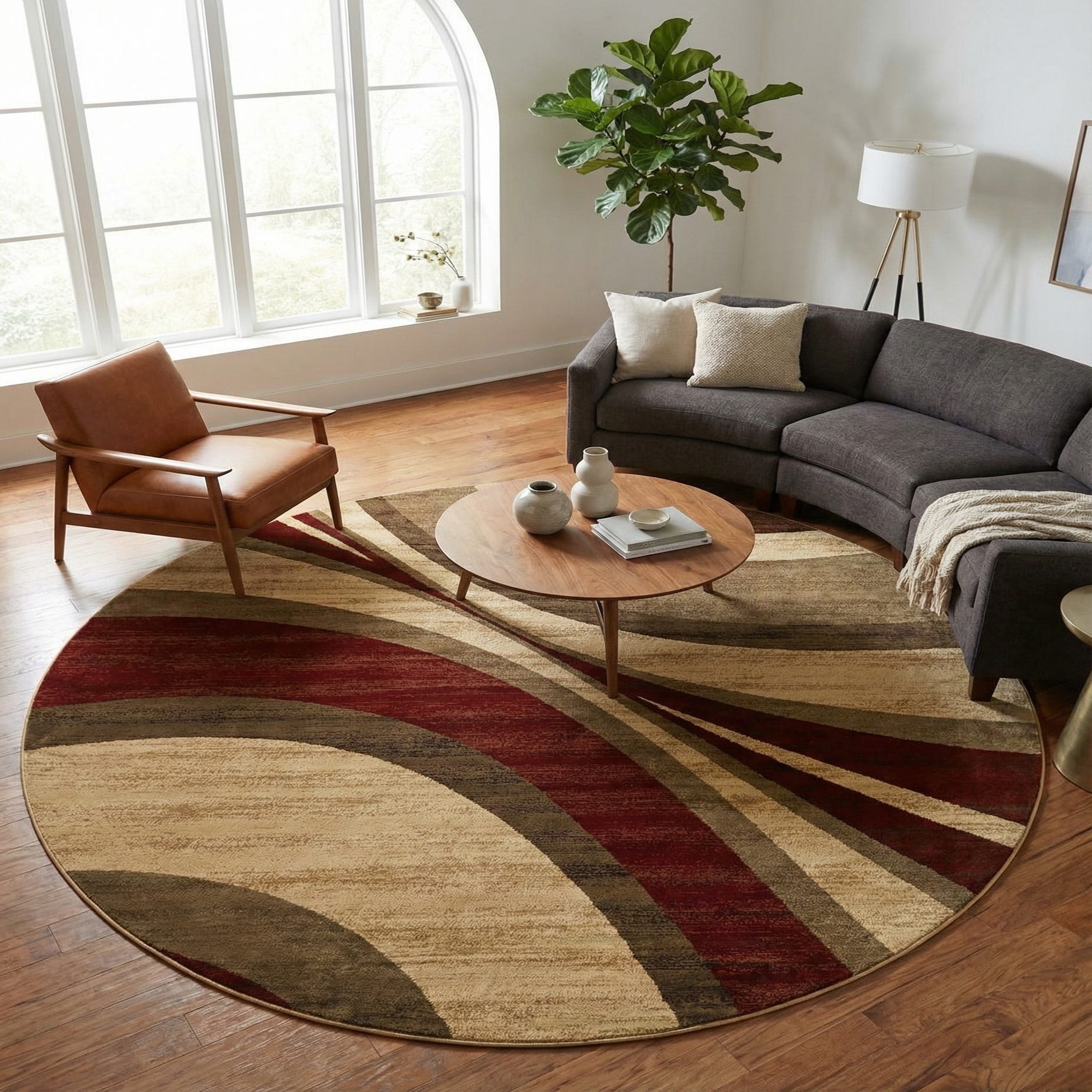 This round piece works well beneath a circular dining table or centered in a cozy seating group to define the conversation area. It pairs naturally with warm wood finishes and leather upholstery, and can anchor a living room with navy or slate-blue throw pillows, olive accents, and brass or dark metal fixtures. The neutral beige base keeps the palette versatile, while the burgundy and deeper tones add depth in transitional, contemporary, or mid-century modern interiors.