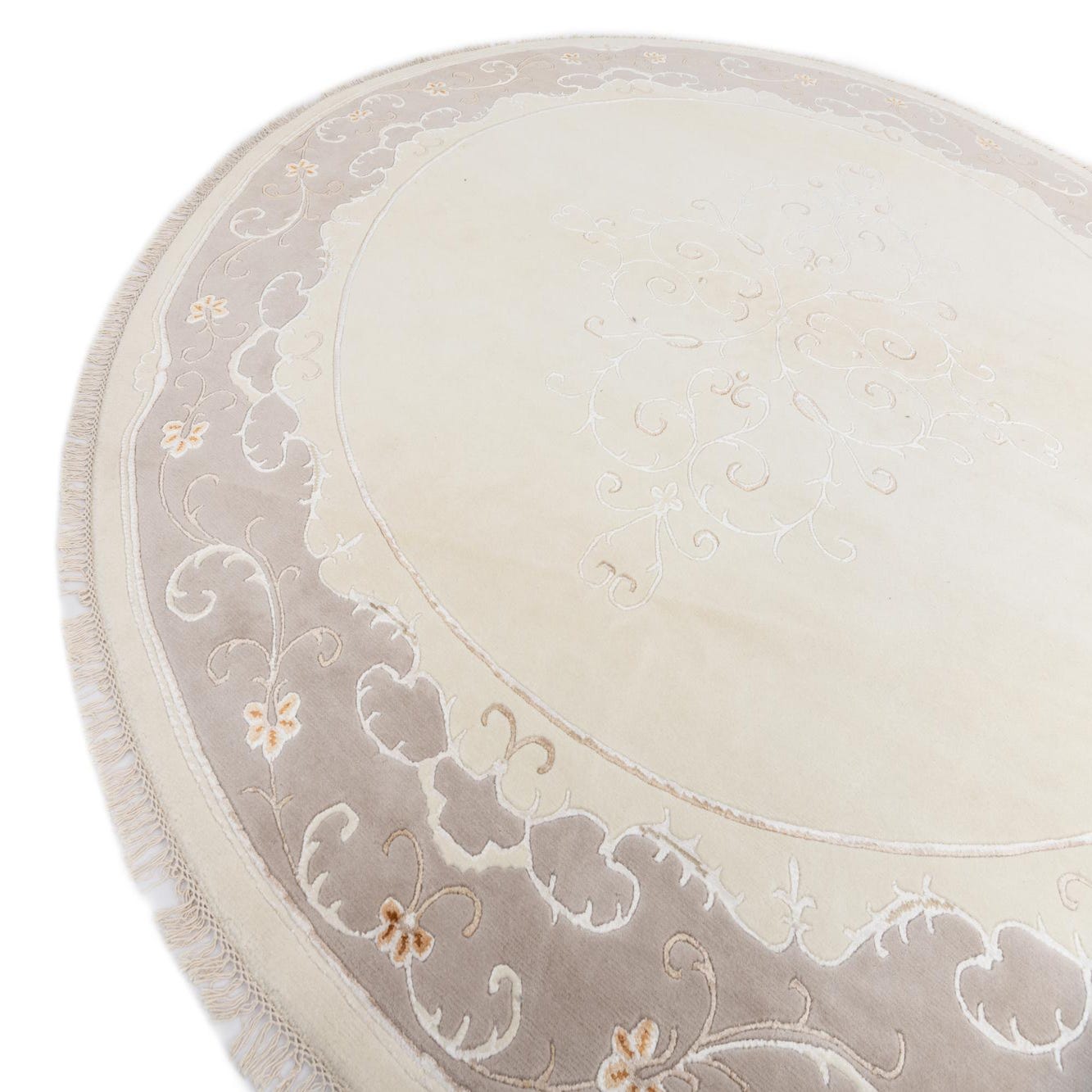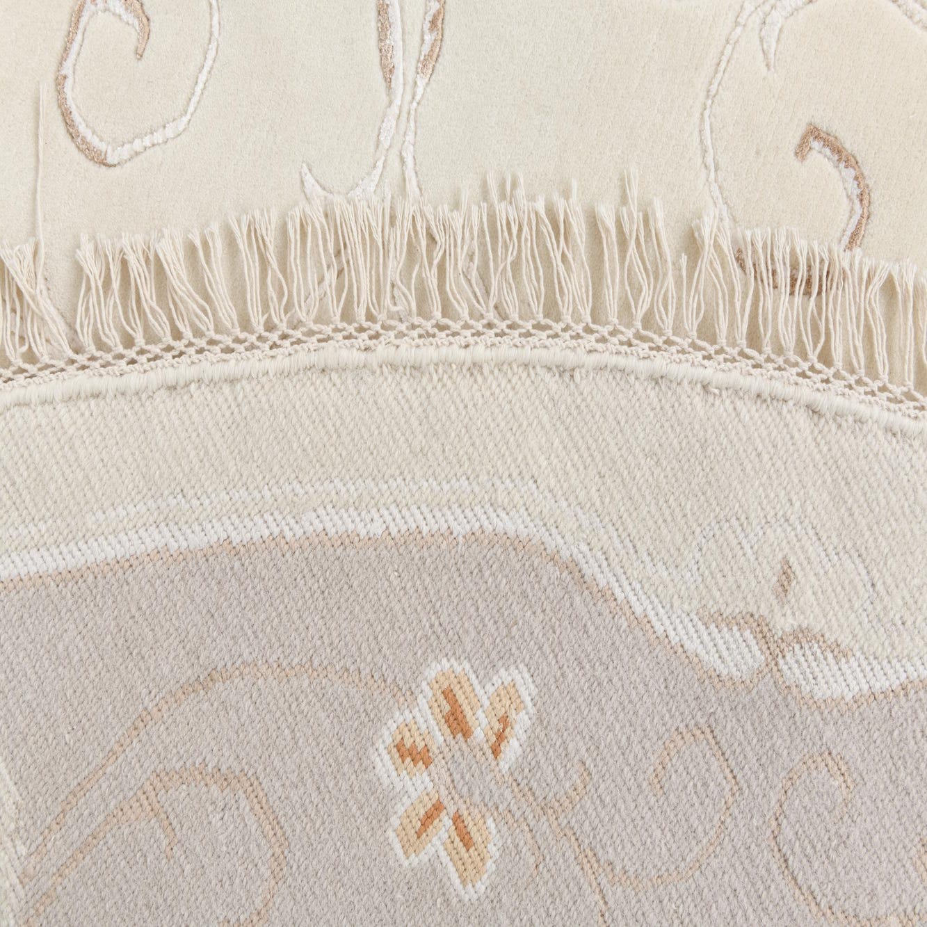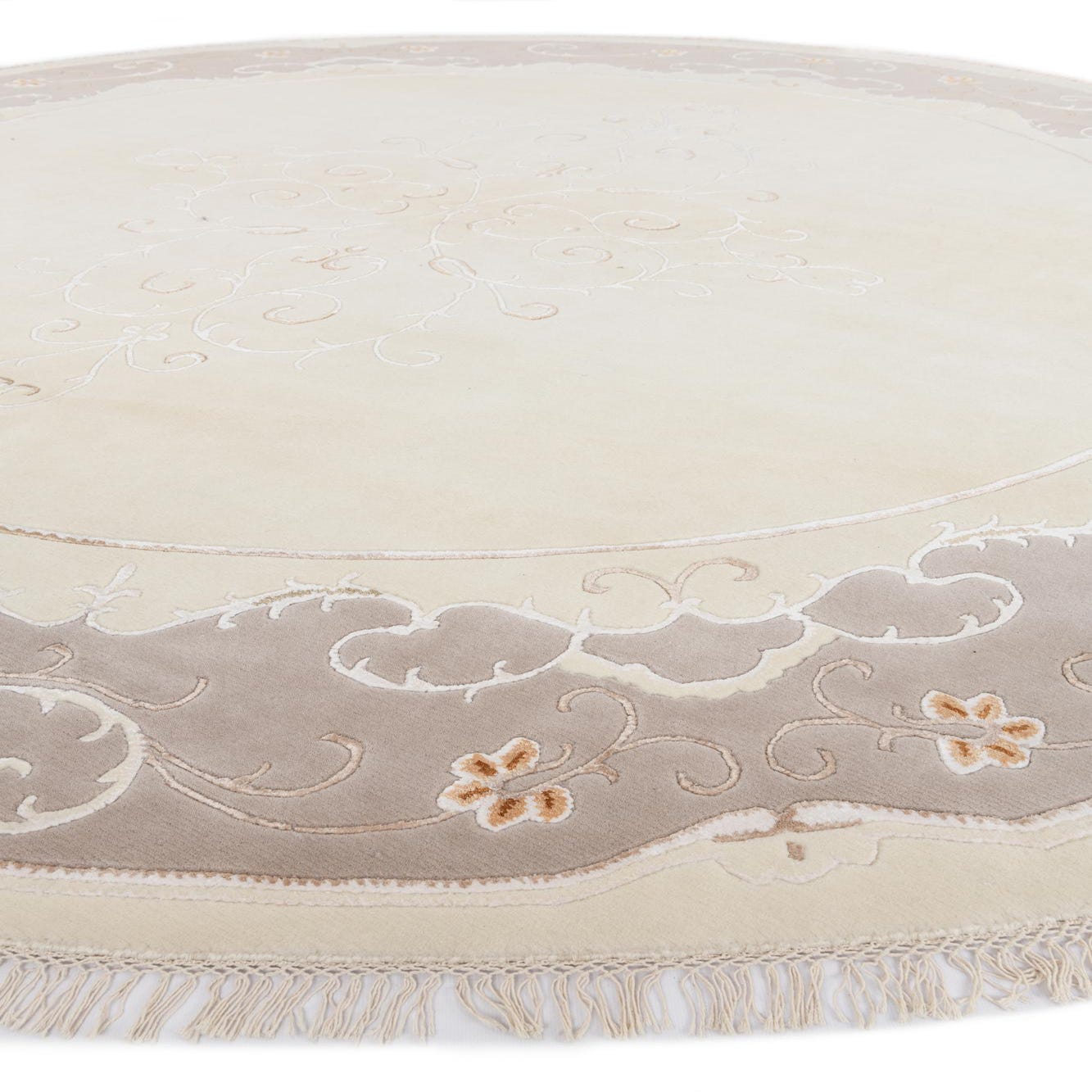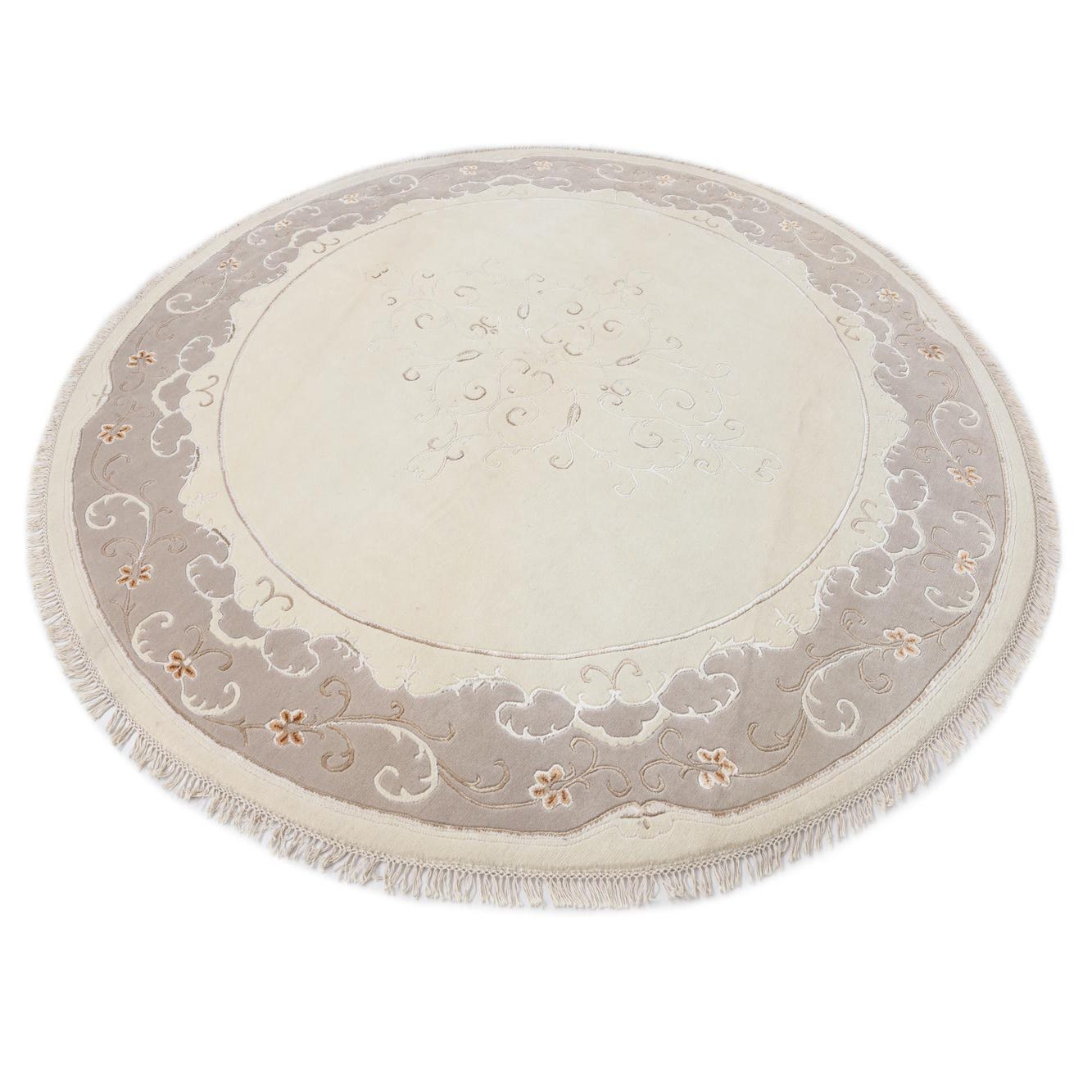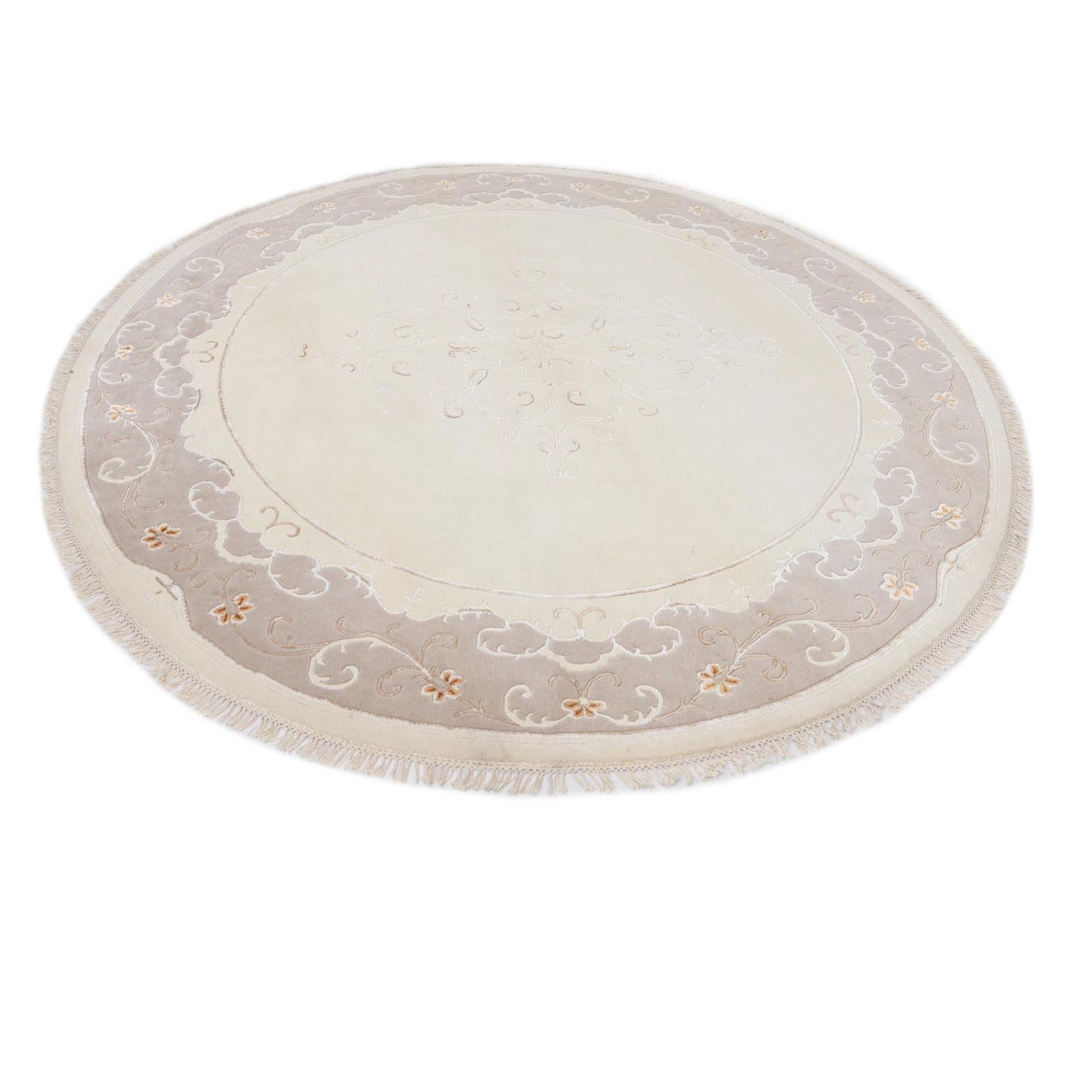 The texture is plush and inviting, owing to the premium quality wool, and the hand-knotted construction ensures each detail is carefully crafted. With its classic color scheme and understated elegance, this rug would enhance a variety of interior design themes, from traditional to more transitional spaces. It could serve as a centerpiece in living rooms, dining areas, or large foyers, providing a sense of warmth and grounding to the designated area. Its round shape is particularly well-suited for rooms with circular furniture arrangements or in open spaces where it can define the flow and create an intimate gathering spot.