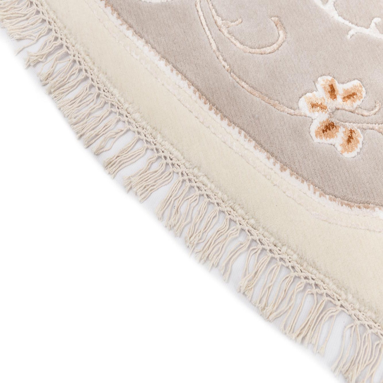 A round Darya rug, 9' 9 x 9' 9, featuring a cream center with delicate white floral swirls and a wide border in shades of brown and tan with intricate oriental patterns and small orange flowers, finished with fringe.