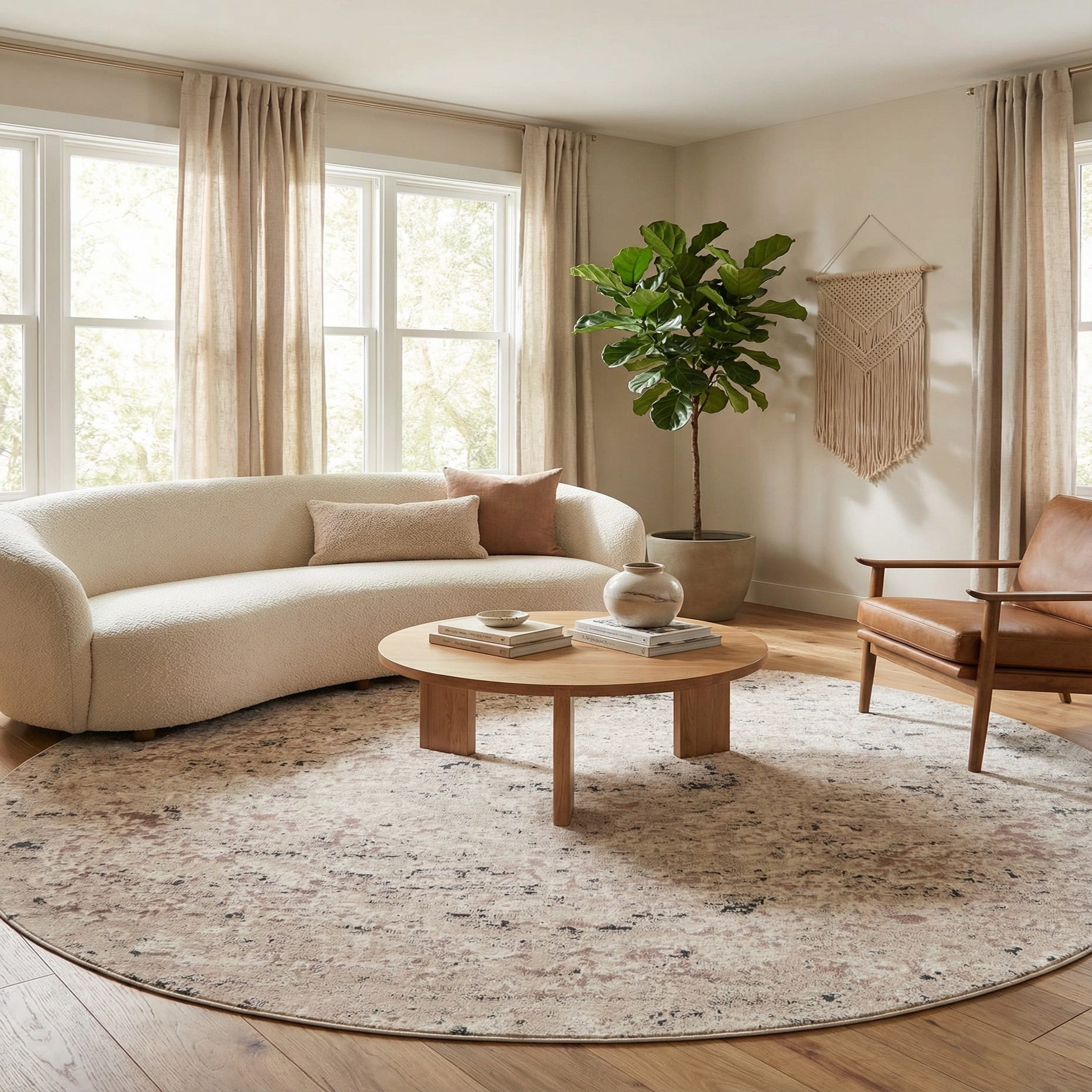 This rug works well in living rooms layered beneath a coffee table, centered in a bedroom to warm a seating area, or under a round dining table to anchor furniture while keeping the palette calm. Pair it with light wood or painted furniture and linen upholstery for a relaxed, contemporary farmhouse look, or combine with charcoal accents and clean-lined sofas for a modern, minimalist setting. The neutral colorway also complements coastal and Scandinavian schemes, where texture and tone are used to create a cozy, cohesive space.