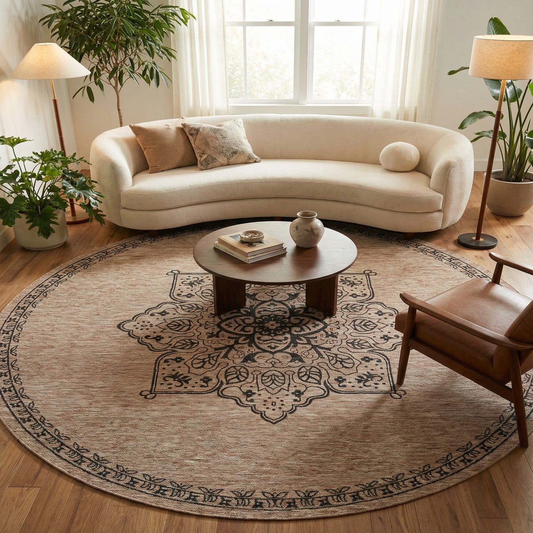 A classic central medallion anchors this round rug, rendered in crisp black against a warm beige ground. The medallion blends floral and foliate motifs into an eight-point arrangement, surrounded by a narrow decorative border that frames the composition. The contrast between the black pattern and beige background keeps the design graphic yet restrained, lending a traditional character that works with both casual and more structured settings.