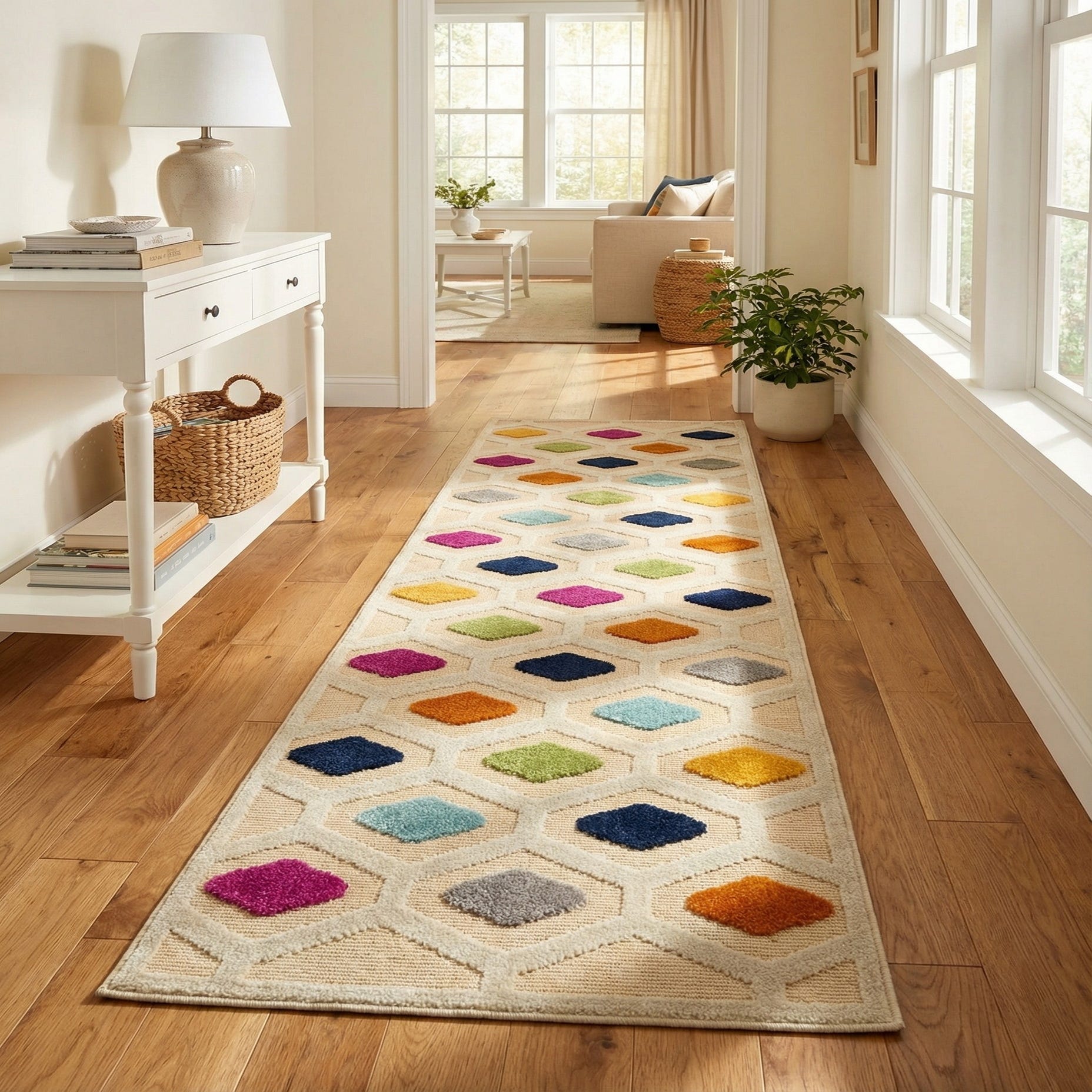 A 10 ft runner rug featuring a cream trellis pattern over a tan base, with colorful textured diamonds in fuchsia, navy, orange, green, yellow, grey, and light blue.