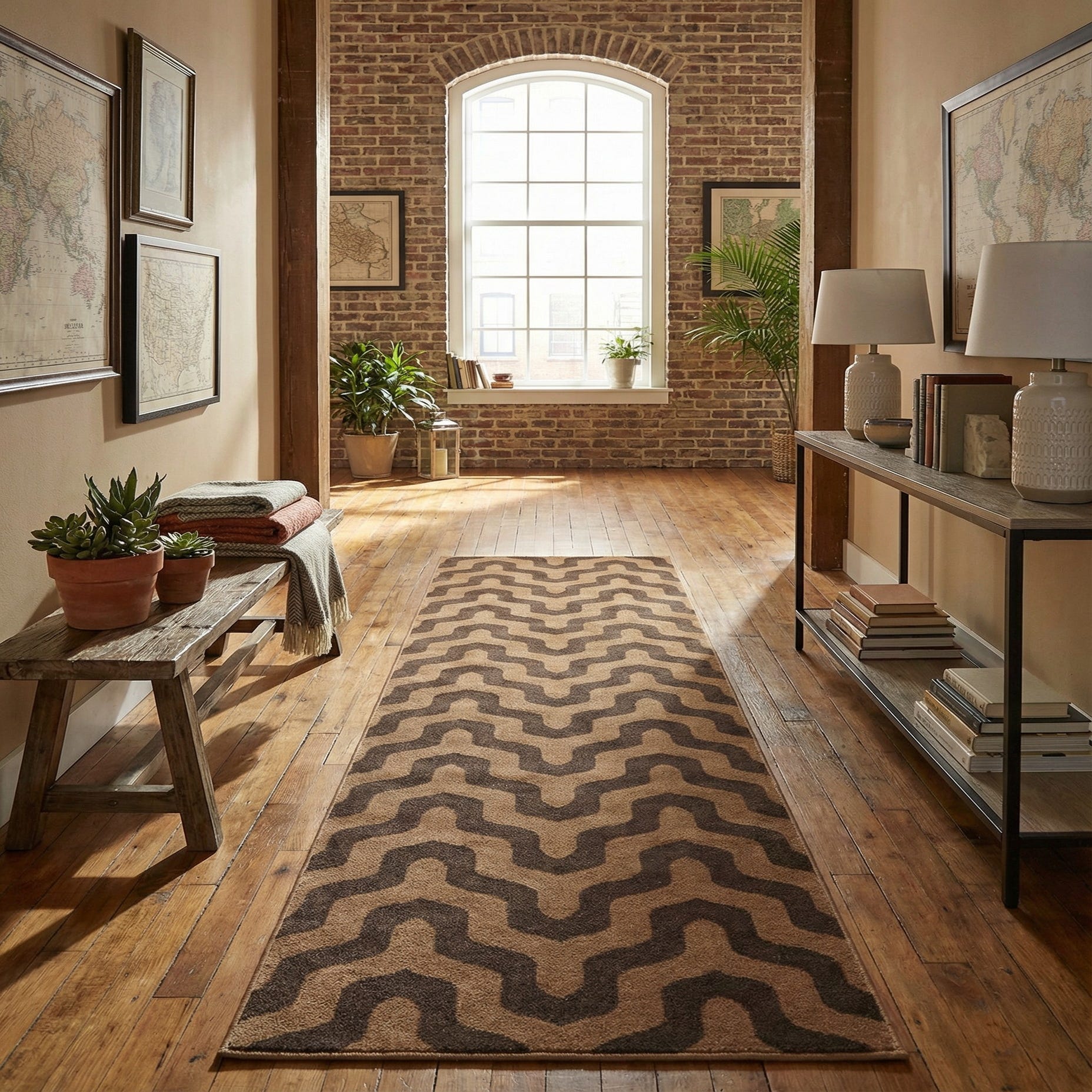 This runner works well in long, narrow spaces such as hallways and entryways, where the directional pattern accentuates length. It pairs naturally with warm wood floors, leather or upholstered seating in earth tones, and transitional or mid-century inspired furnishings. Use it to anchor a kitchen galley, define a corridor in an open-plan living area, or add pattern and warmth to a home office or den.