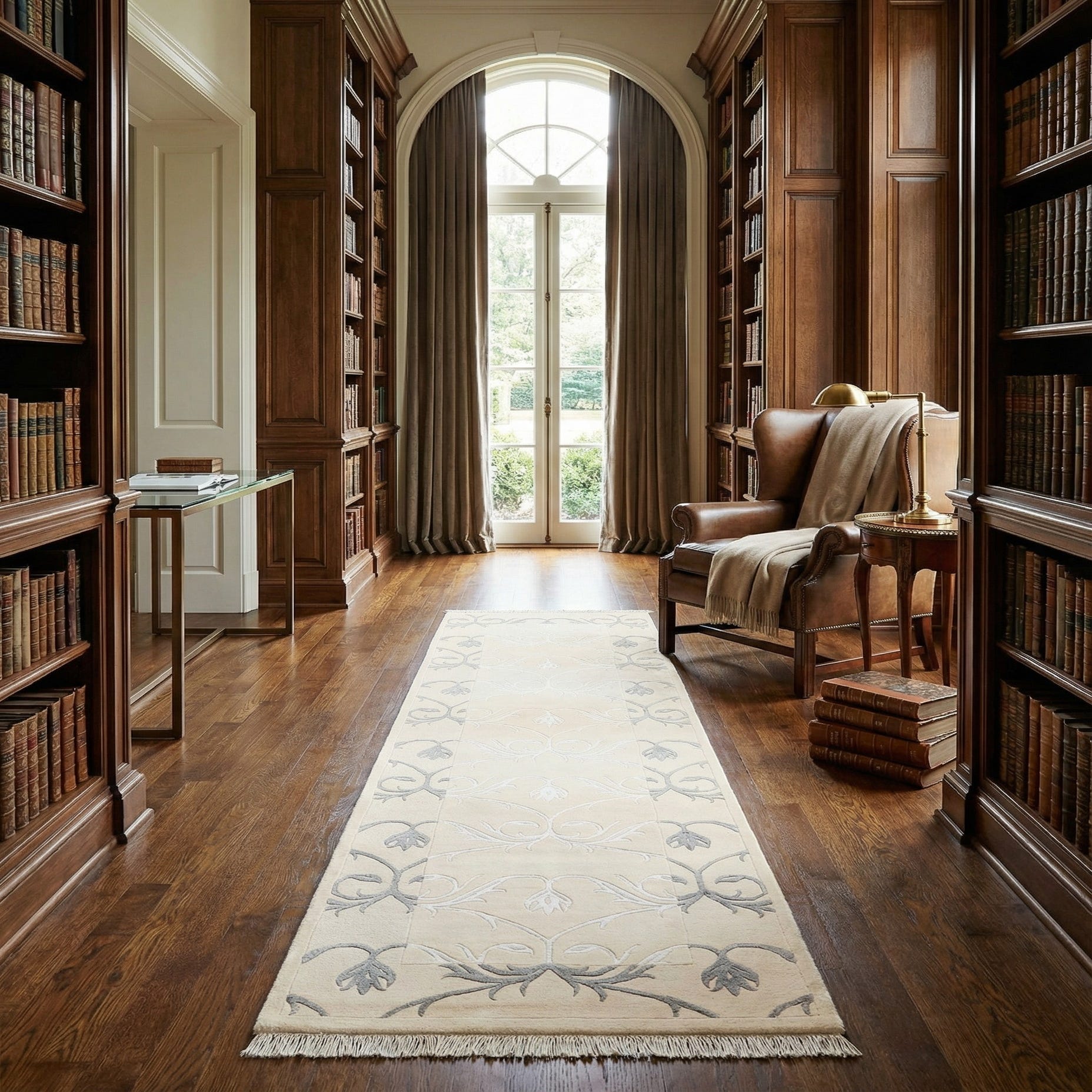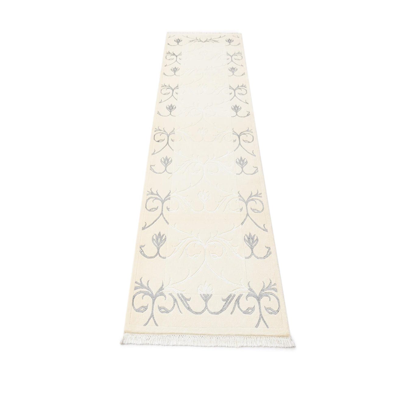 The Darya collection presents a sophisticated 10 Ft Runner handcrafted from a blend of wool and cotton, providing both durability and a soft, inviting texture. The rug showcases an elegant pattern with organic motifs, where stylized floral and vine patterns flow harmoniously in a symmetrical arrangement.