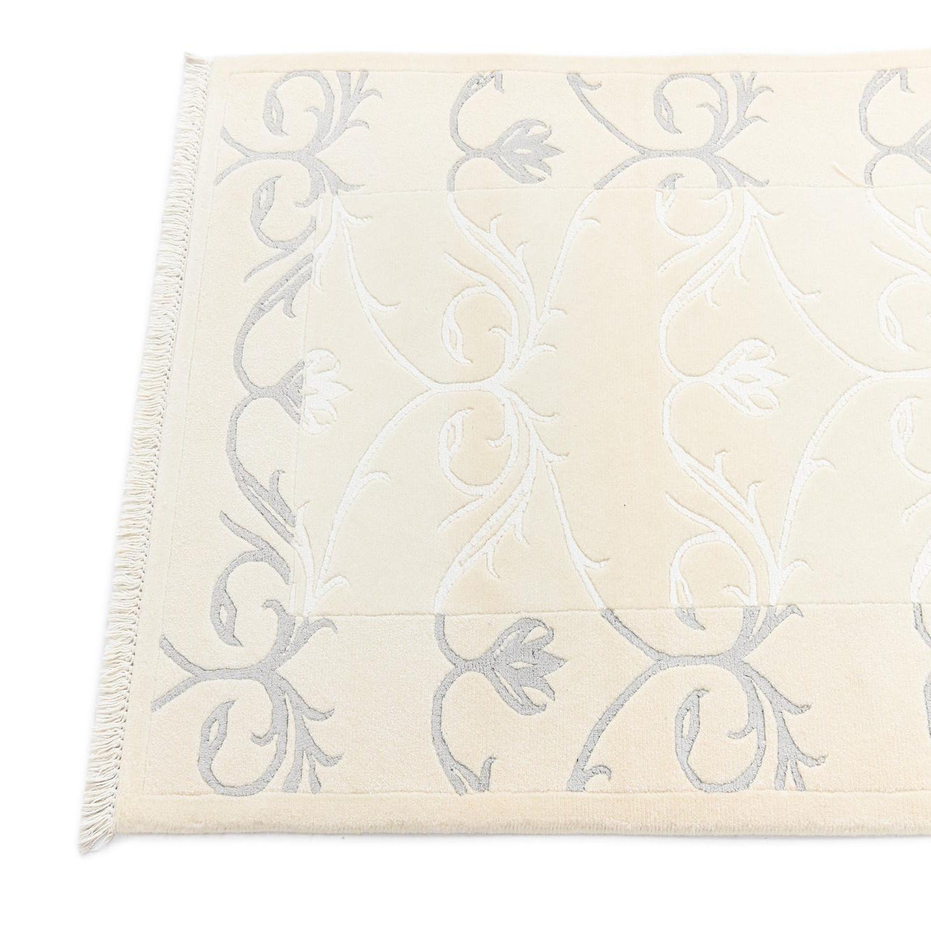 The color palette is a calming and neutral mix, with a beige background accented by designs in shades of gray, ivory, and silver. This subdued color scheme allows for versatile placement in interior design settings, ensuring the rug complements rather than competes with surrounding decor.