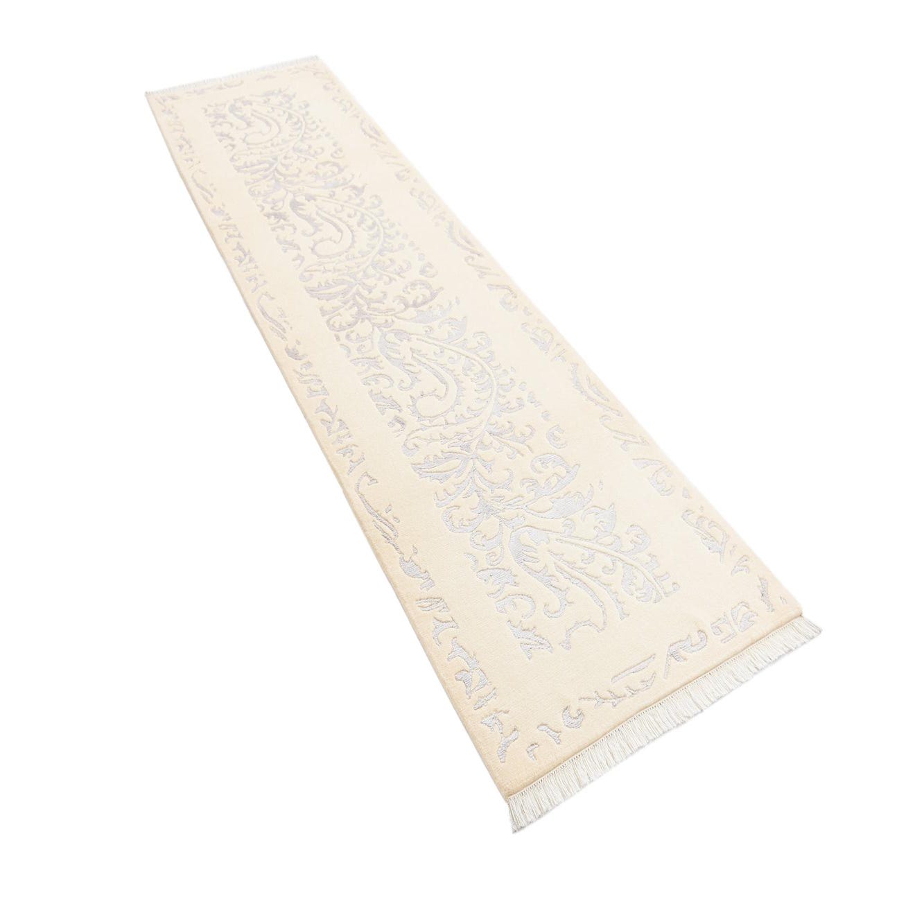 A 10 ft Darya runner rug in cream and light brown, featuring a central modern Persian floral pattern and fringe.