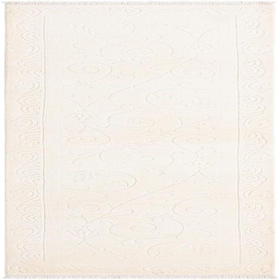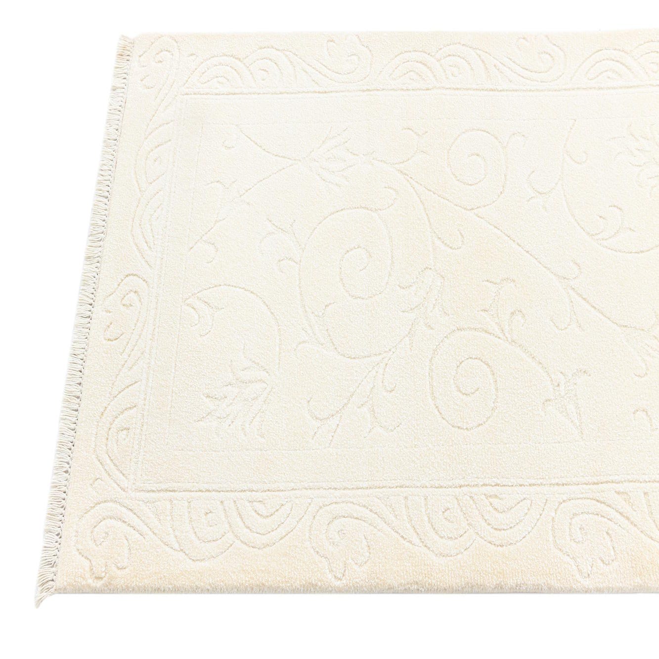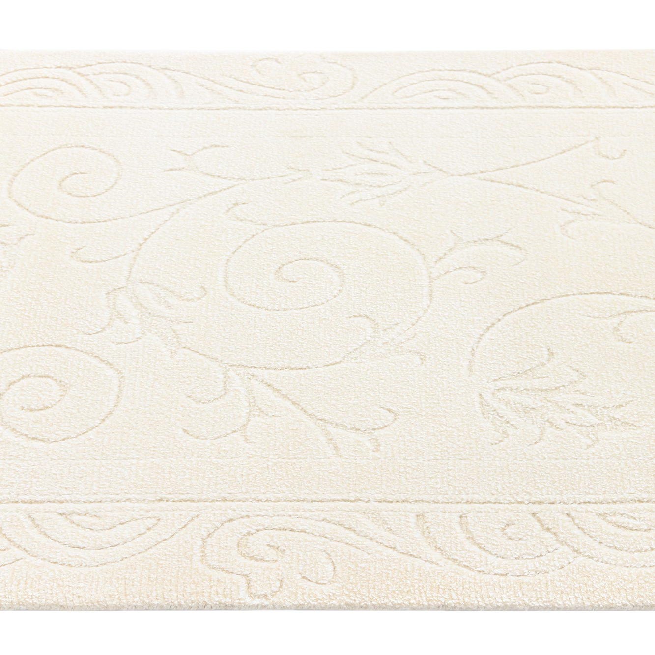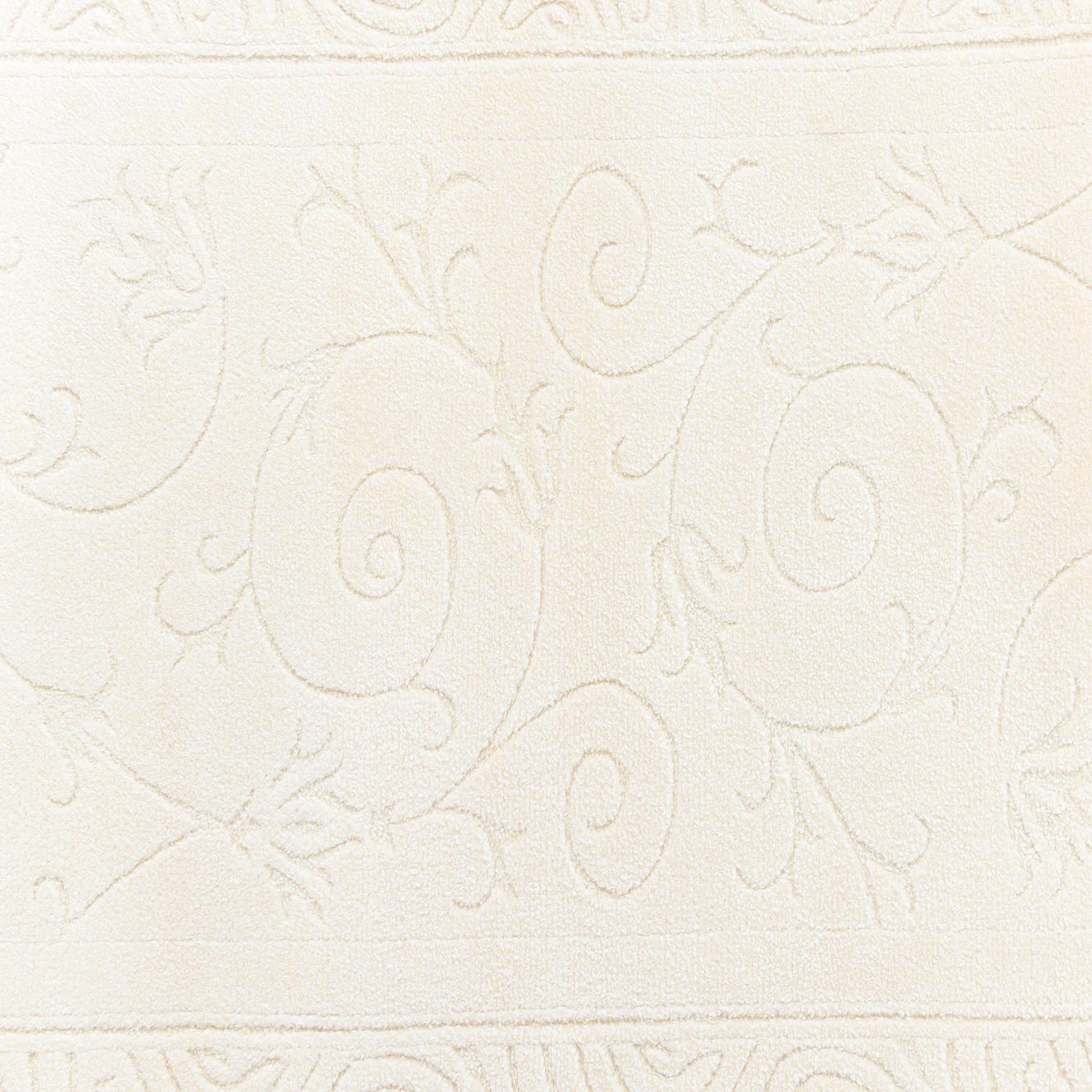 A 10 ft Darya runner rug in ivory with a subtle raised Persian floral pattern and fringed ends, perfect for a hallway.