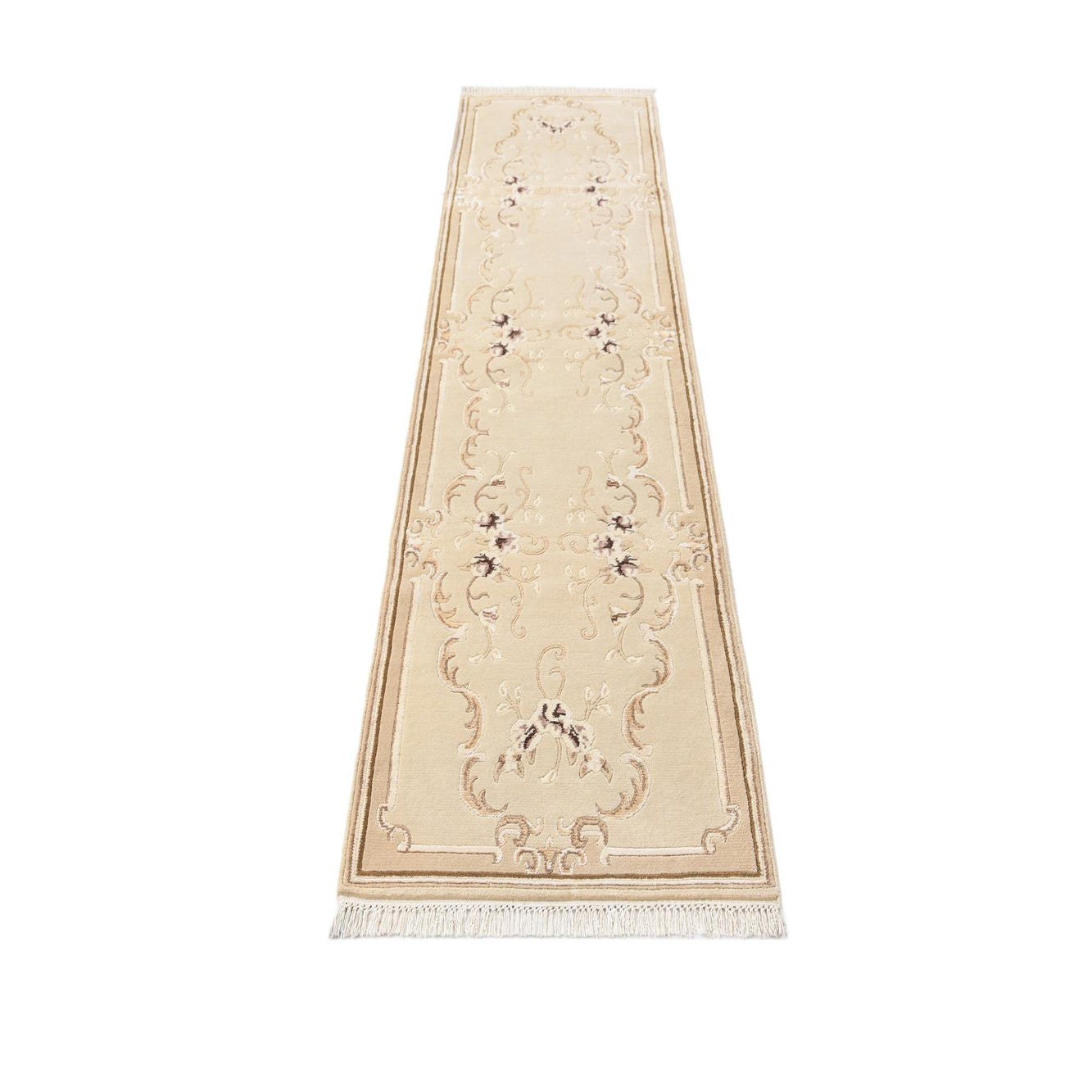 A 10 ft Darya runner rug in brown and ivory, featuring a modern Persian floral pattern, ideal for a hallway.