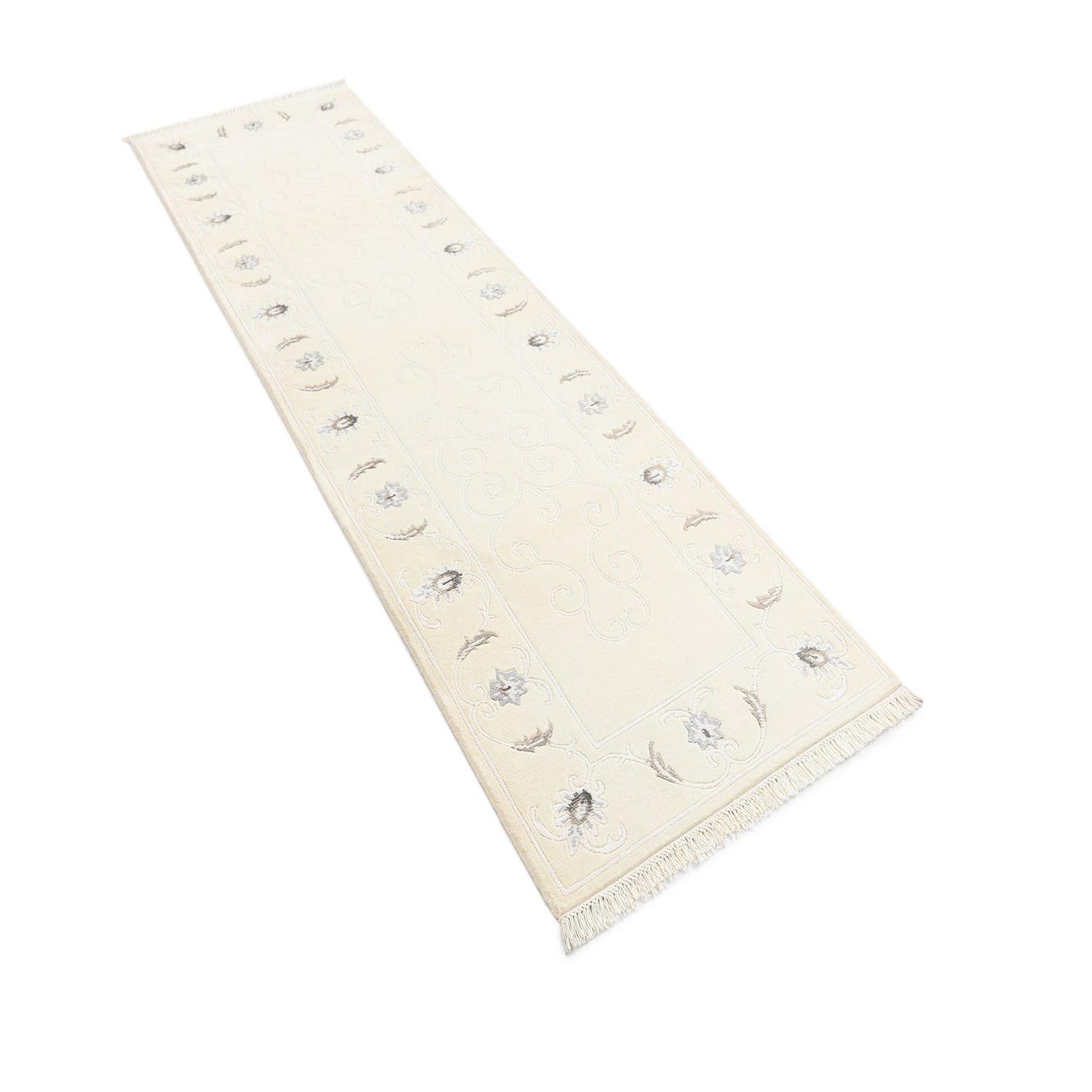 This Darya Collection runner, spanning 10 feet in length, is a hand-made creation that blends the timeless craftsmanship of wool and cotton. The rug presents a beige background complemented by an array of colors including brown, ivory, light brown, and silver. The decorative motifs, featuring symmetrical floral and scroll designs, bring a sense of balance and elegance, making this rug a suitable accessory for a variety of interior design aesthetics.