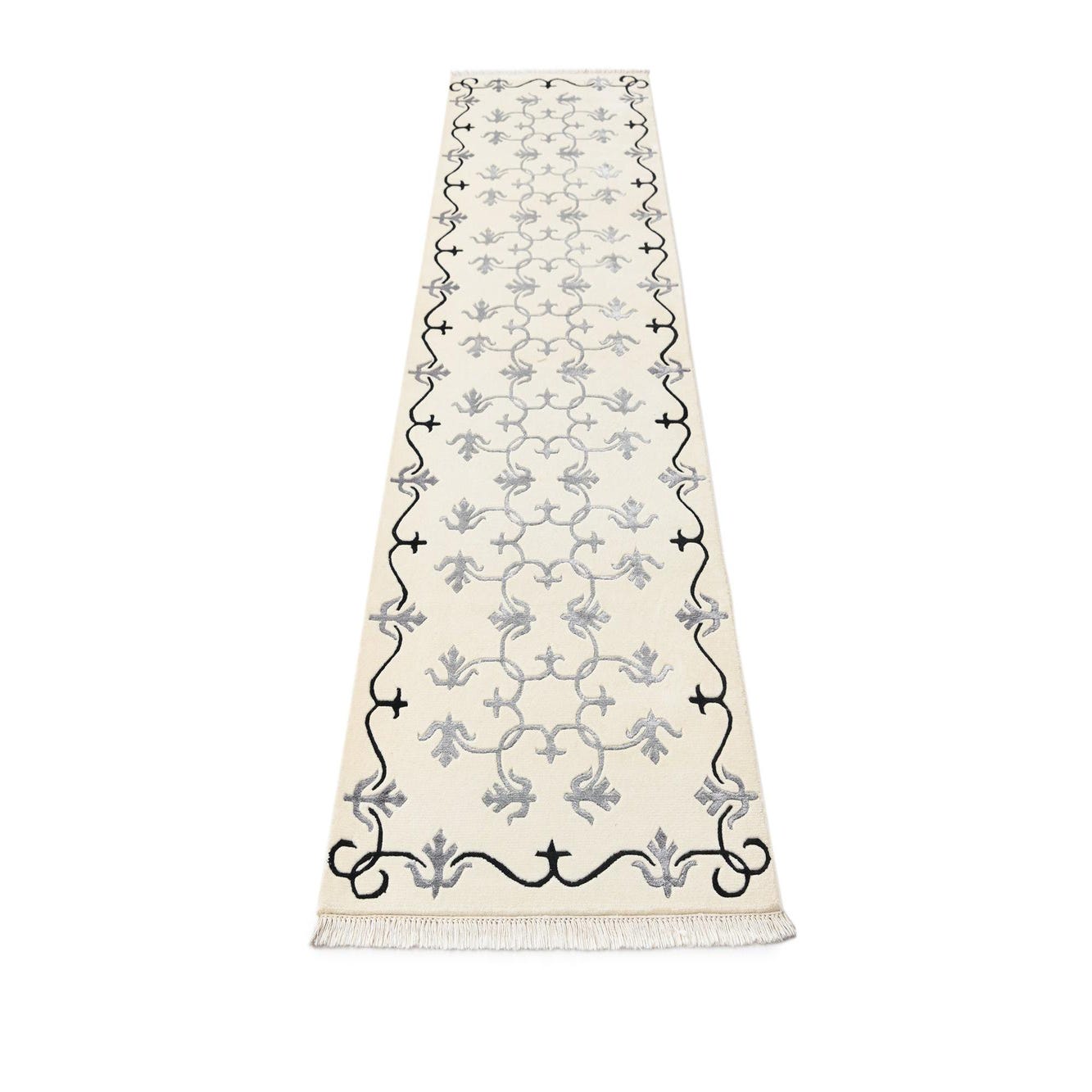 The Darya Collection 10 Ft Runner embodies a timeless elegance with its classic design blending neutral and contrasting hues. A beige background sets the stage for intricate scrollwork and floral motifs in an array of black, gray, and silver, culminating in a refined visual aesthetic. Handmade of wool and cotton, this rug asserts its quality and durability while boasting a plush texture underfoot.