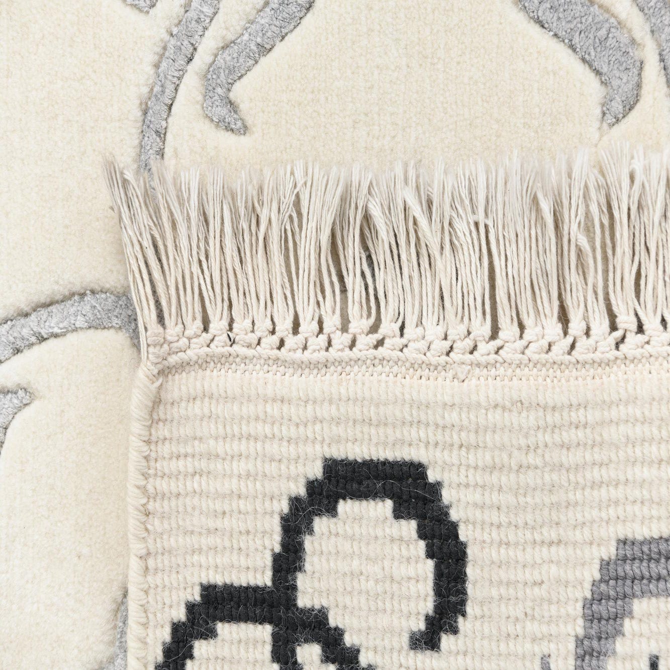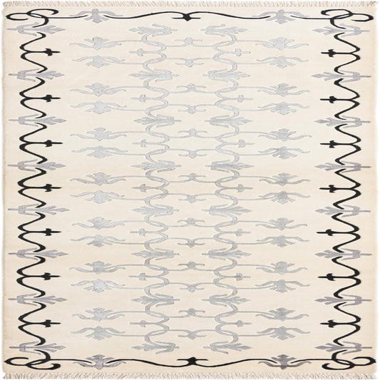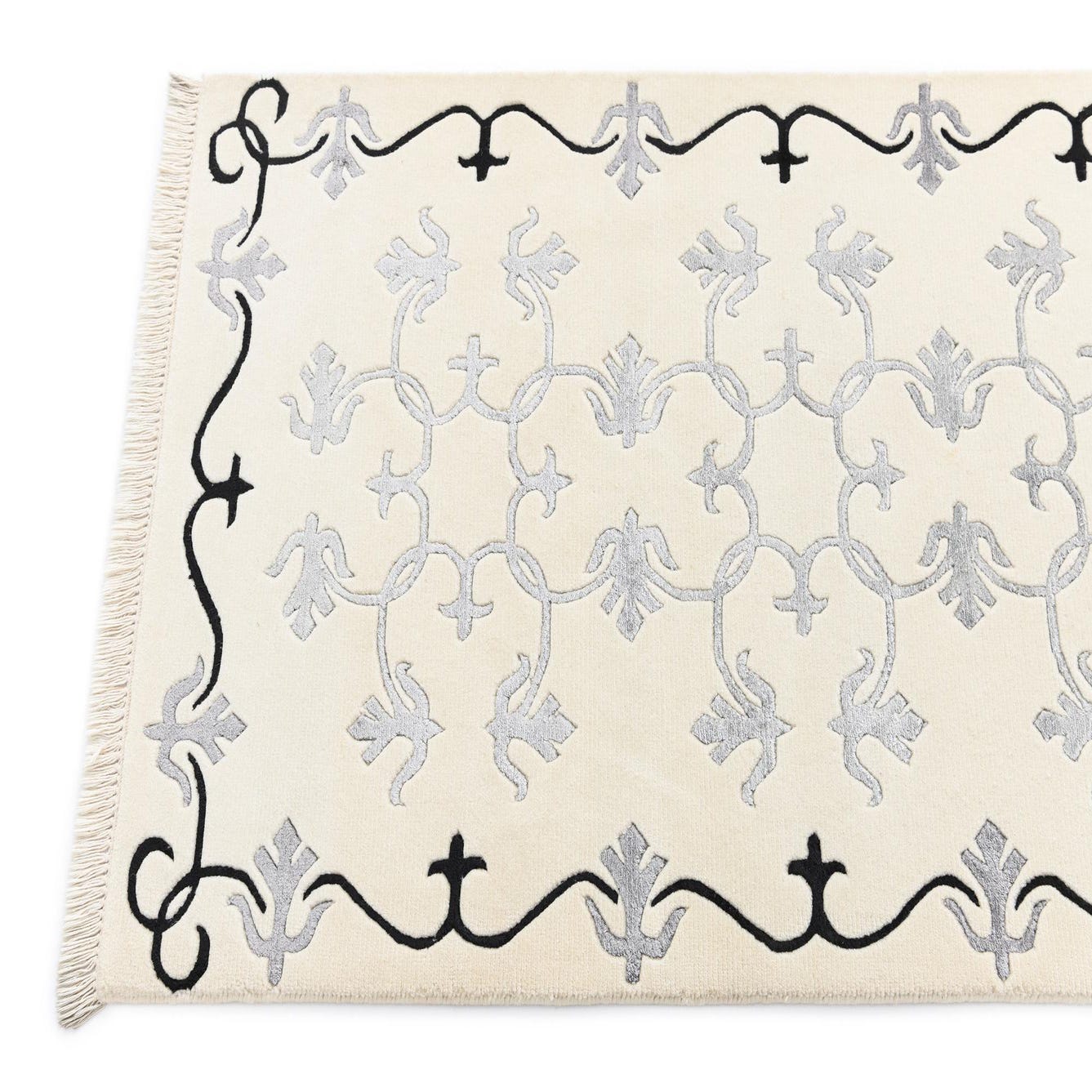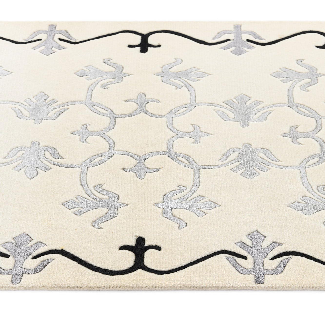 Primary color is Beige. Colors in this rug include: Beige, Black, Gray, Silver.