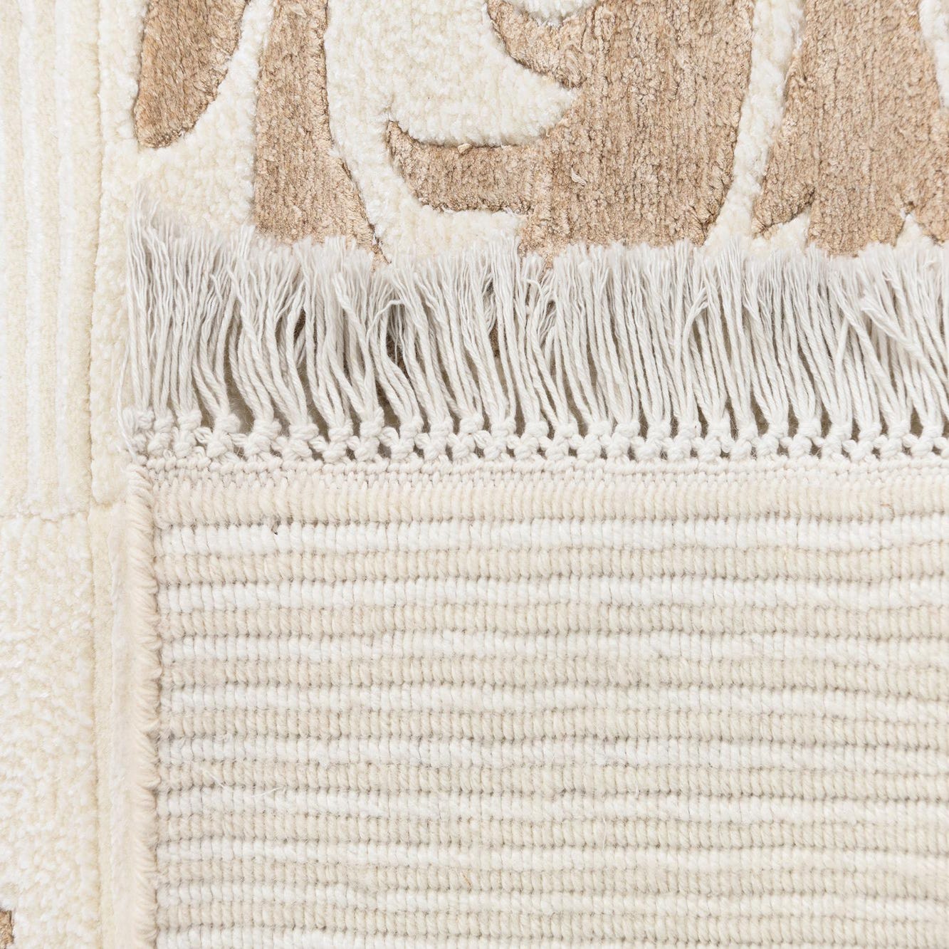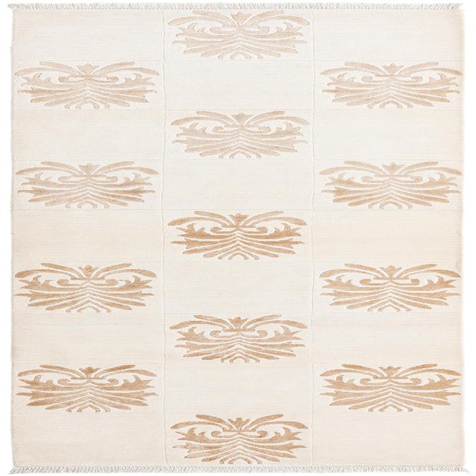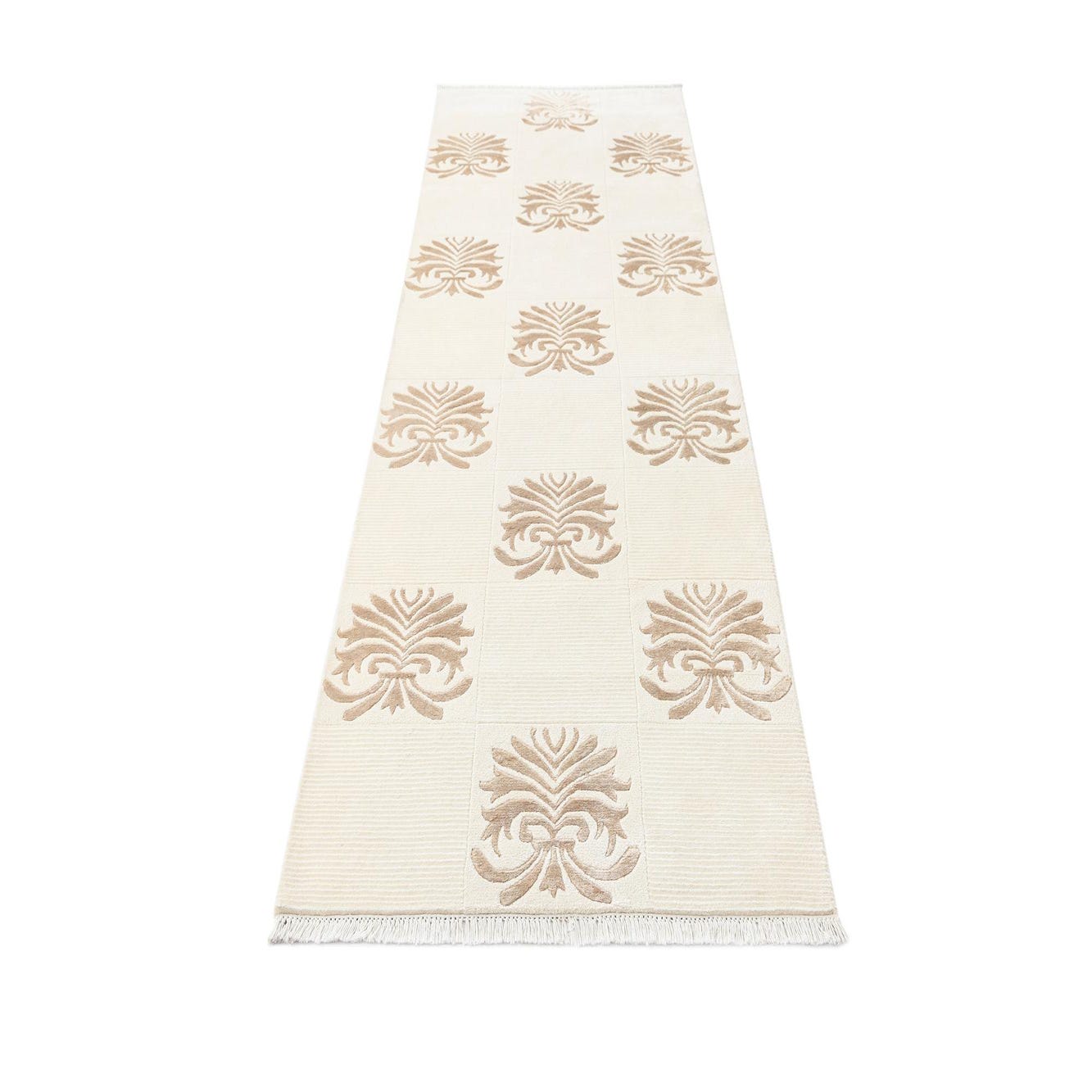 The design features a series of symmetrical motifs in a striking yet understated combination of beige, brown, ivory, and light brown hues, set against a warm beige background. Each motif is intricately rendered, giving the piece a sense of elegance and formality. The textural weave of this runner rug adds depth and contrast to the visual symmetry, while the fringe detailing on the edges contributes a touch of artisanal charm.
